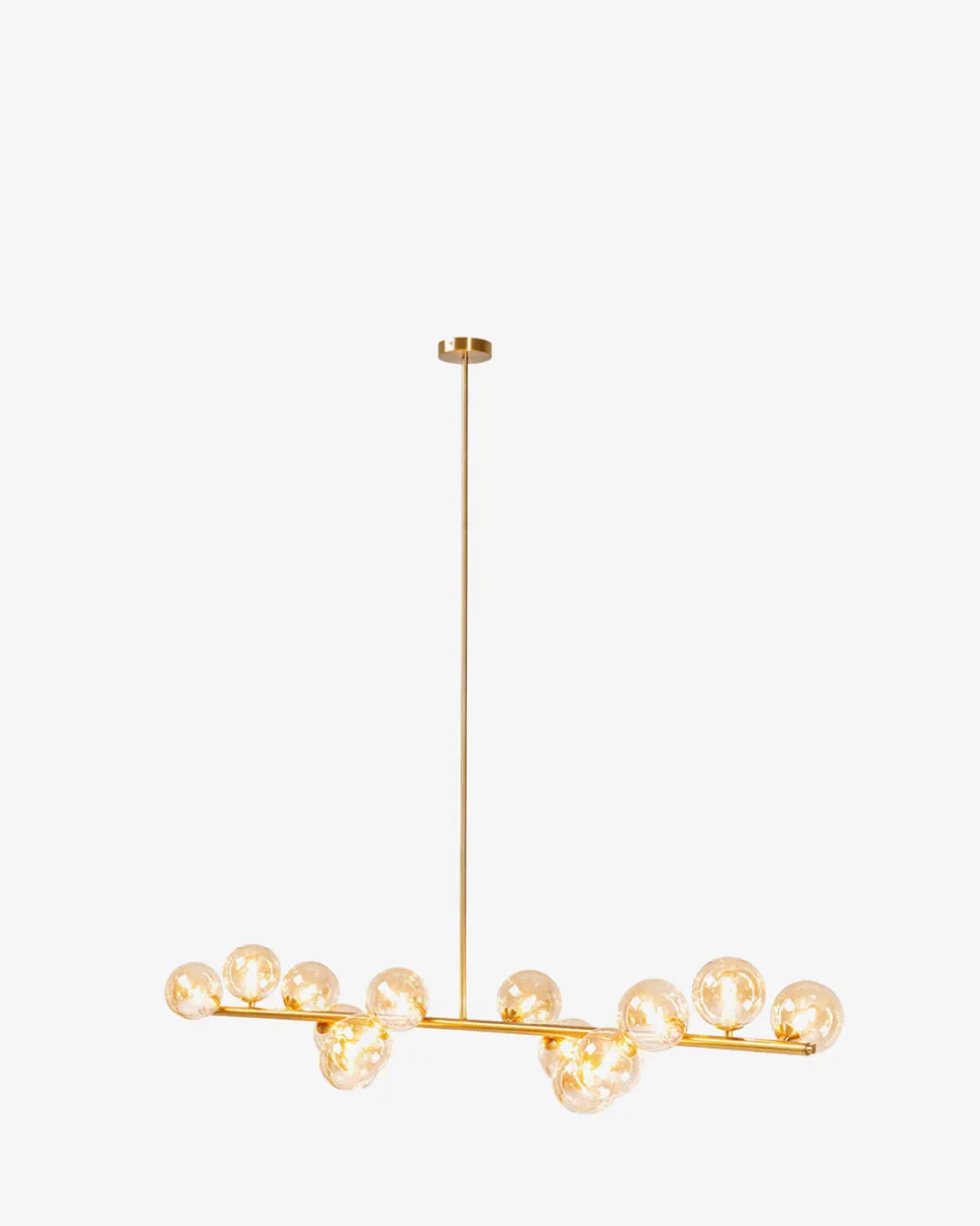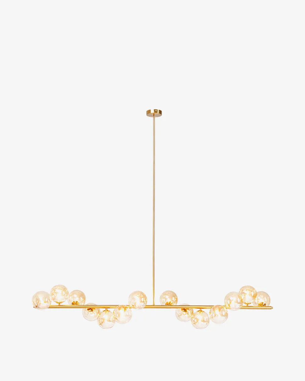 Scala Balls loftlampe – messing med gyldent glas. Skulpturel pendel med 14 glaskupler og justerbar højde.