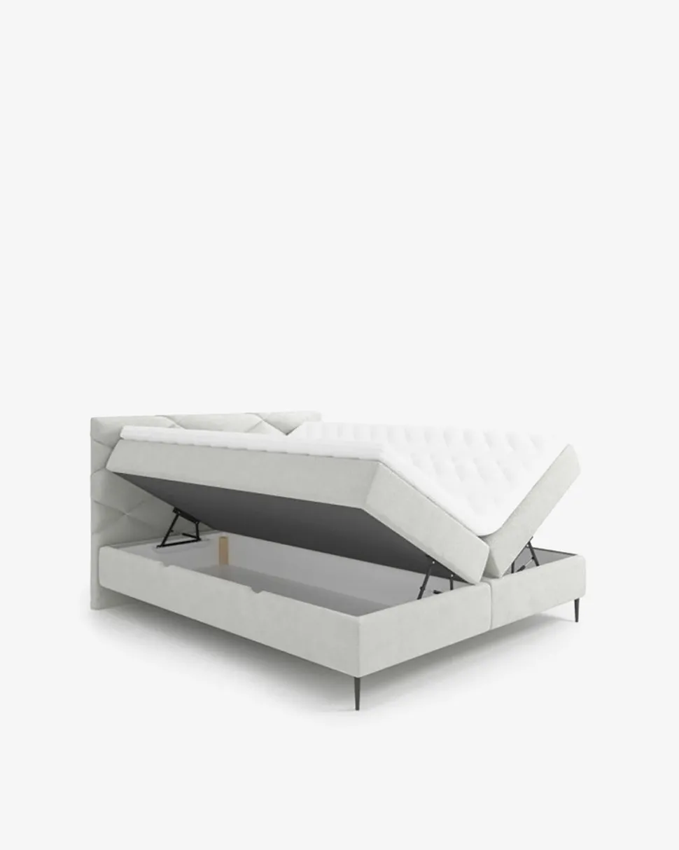 Sengens elegante design fremhæves af en hovedgavl med diamantformede syninger, og de 15 cm høje ben tilføjer lethed til hele strukturen.