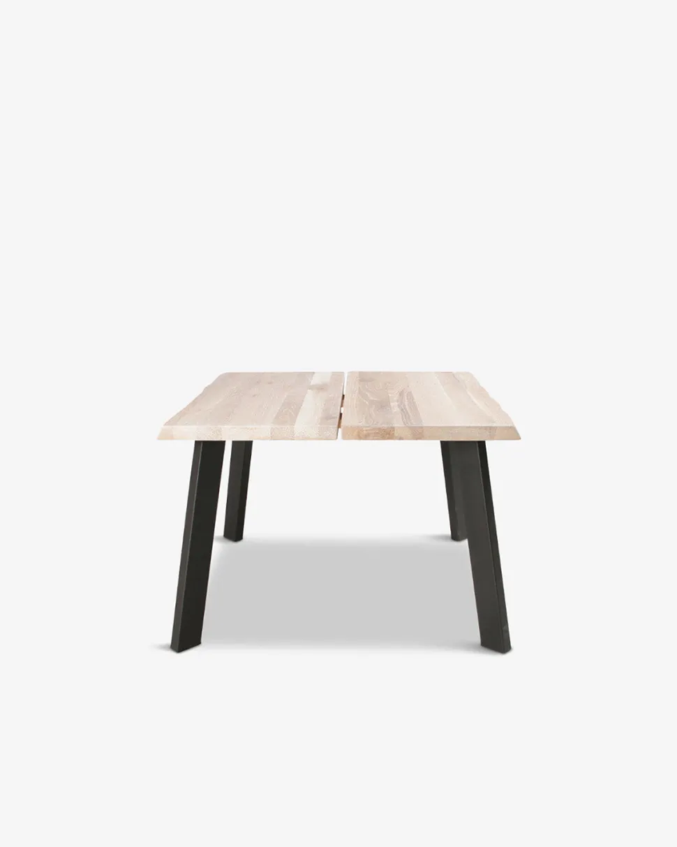 Sofabord med bordplade i smukt rustik design, med to planker i massiv eg. Bordpladen er udført i hvid olieret europæisk eg med natur kant. Stellet er lavet af sortlakeret metal.