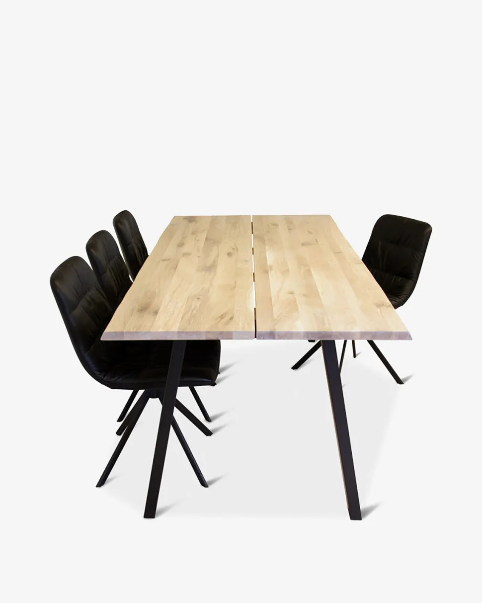 Plankebord med bordplade i smukt rustik design, med to planker i massiv eg. Bordpladen er udført i hvid olieret europæisk eg med natur kant. Stellet er lavet af sortlakeret metal.