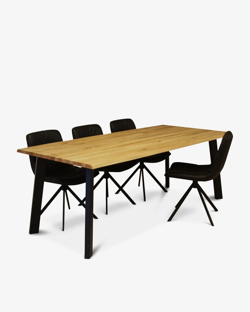 Plankebord med bordplade i smukt rustik design, med to planker i massiv eg. Bordpladen er udført i europæisk naturolie eg med natur kant. Stellet er lavet af sortlakeret metal.