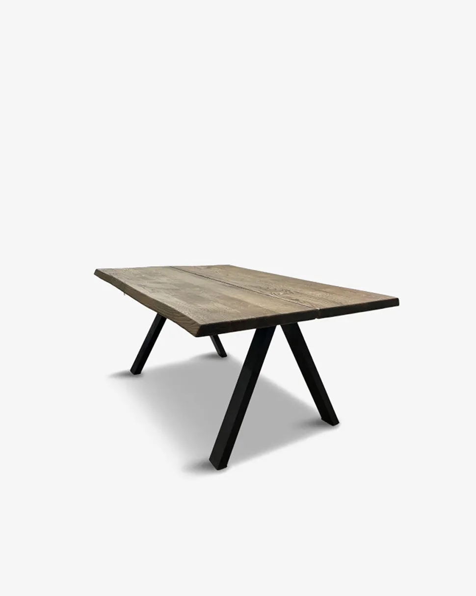Sofabord med bordplade i smukt rustikt design, med to planker i massiv eg. Bordpladen er udført i smoked europæisk eg med naturkant. Stellet er V-stel lavet af sortlakeret metal. Knaster og revner kan være kittet. Dette gøres for at give en glat overflade og beholde det rå look.