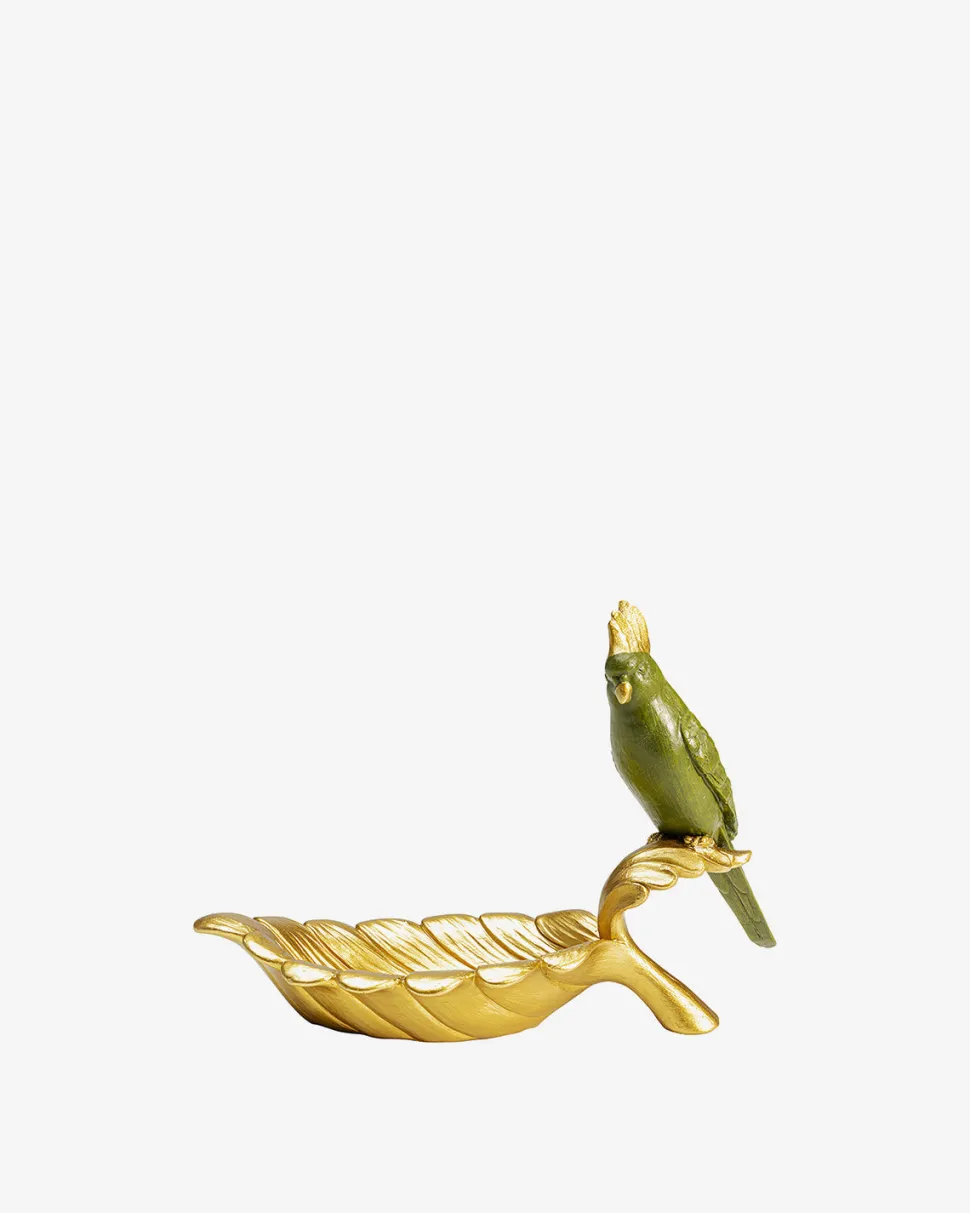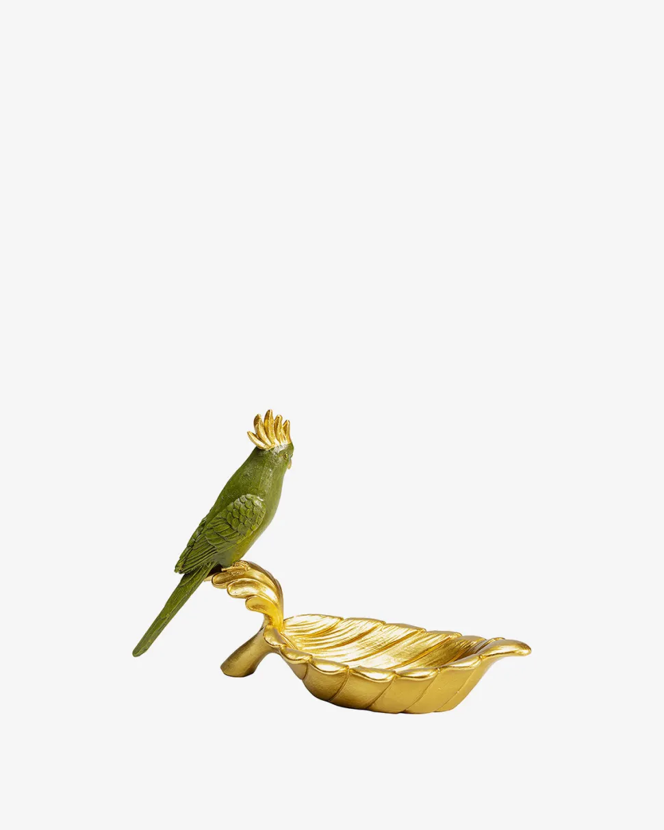 Skål med papegøje er en sjov og dekorativ figur, der kombinerer funktion og blikfang på den helt rigtige måde. Skålen er formet som et guldfarvet blad, og på stilken sidder en grøn papegøje, som om den holder øje med indholdet.
