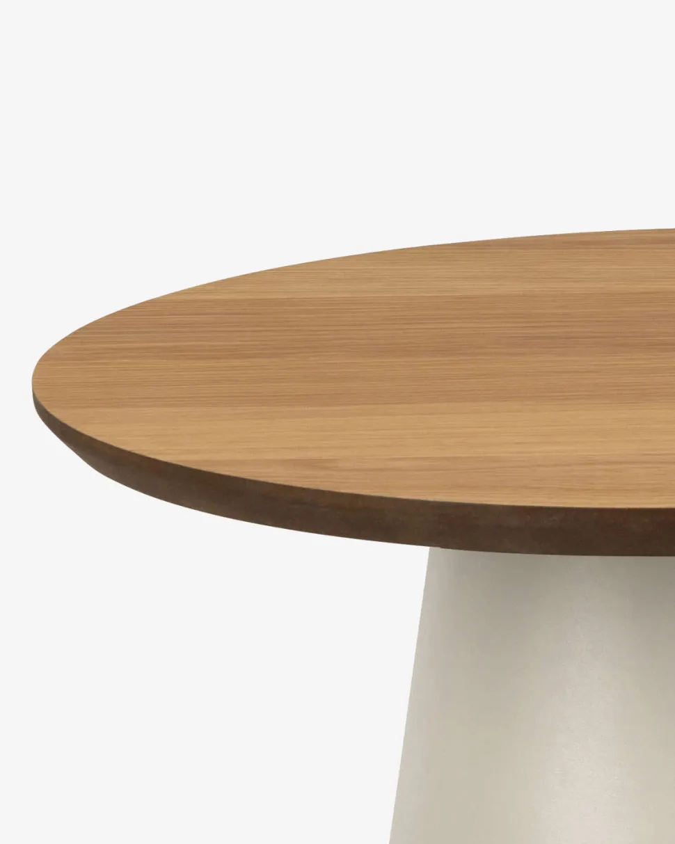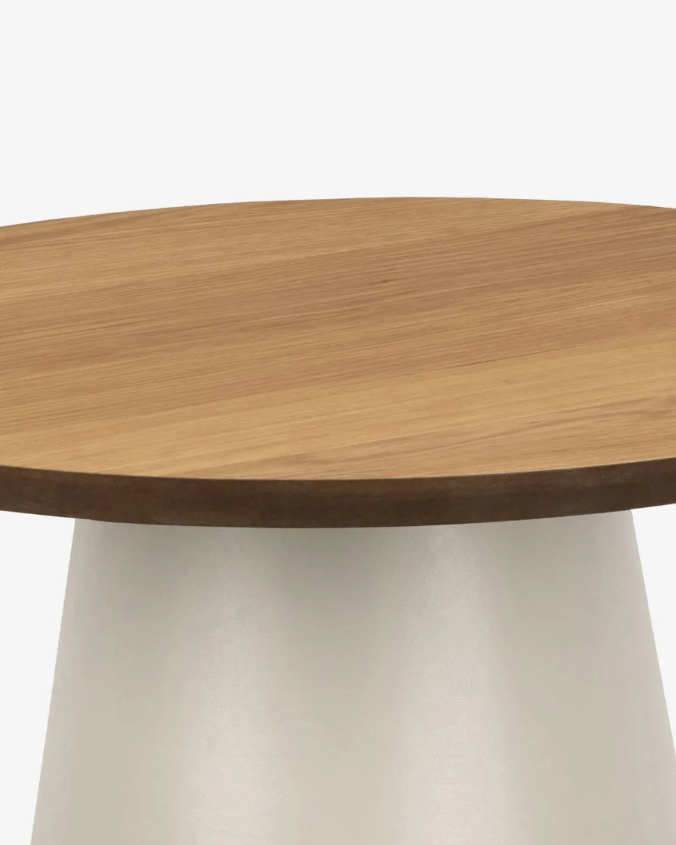 Soli sofabordet forener naturlige materialer og bløde former i et elegant nordisk design. Den runde bordplade i smuk eg finer giver varme og karakter til rummet, mens det grå kegleformede stel skaber en spændende kontrast og et stabilt udtryk.
