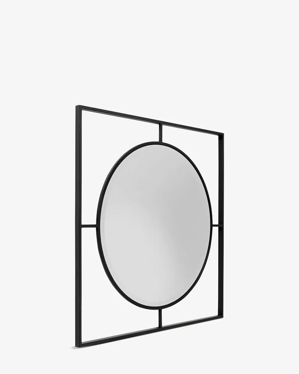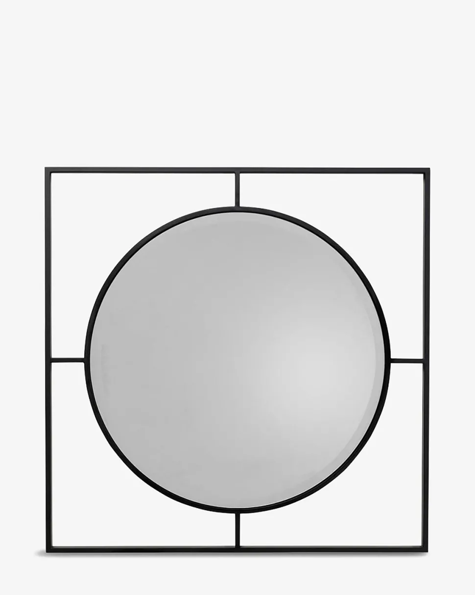 Dekorativt og stilfuldt firkantet spejl med rundt glas og sort stålramme.