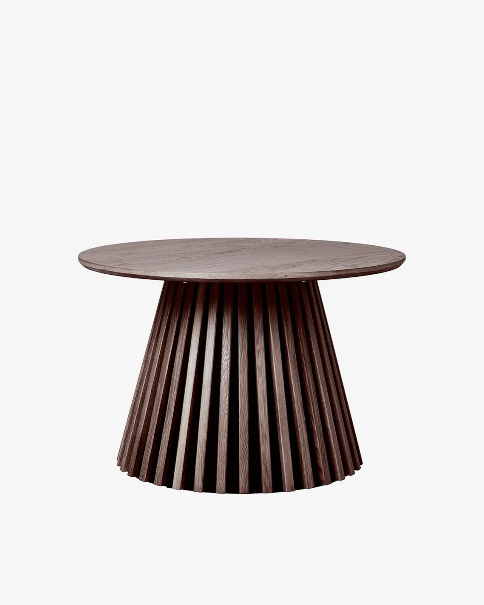 Stella sofabordet er en elegant og harmonisk tilføjelse til stuen. Med sin runde bordplade i smoked eg finer og karakteristiske centersokkel med lodrette lameller, forener bordet blød form og moderne detaljer i et let og stilrent design.
