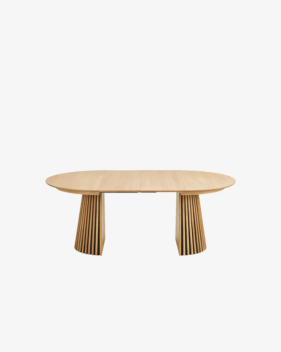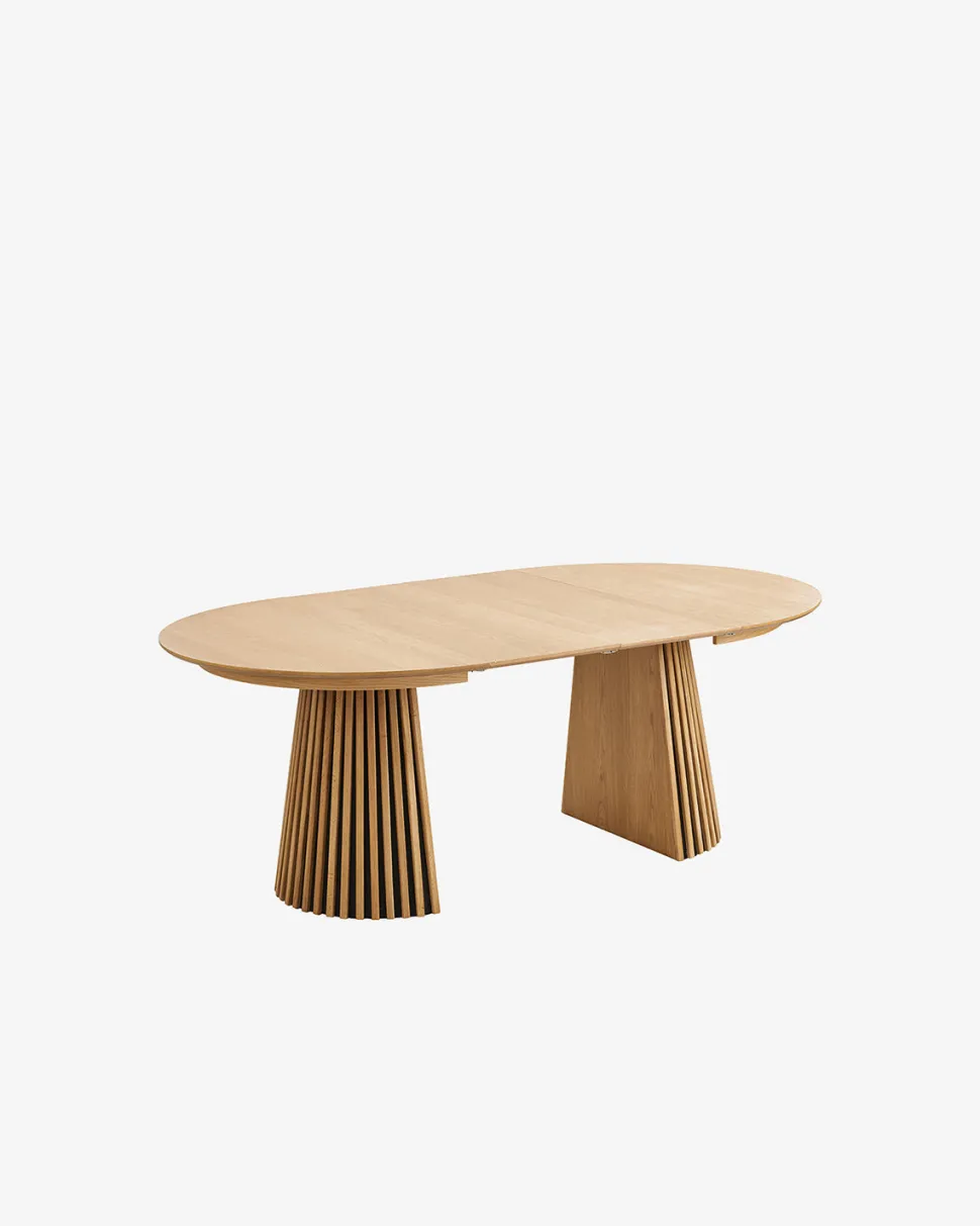 Bordet kan nemt udvides med de medfølgende tillægsplader, så det opnår en samlet længde på 200 cm. Perfekt, når der kommer gæster. Den centrale sokkel med lodrette lameller tilføjer både karakter og stabilitet og giver god benplads hele vejen rundt.