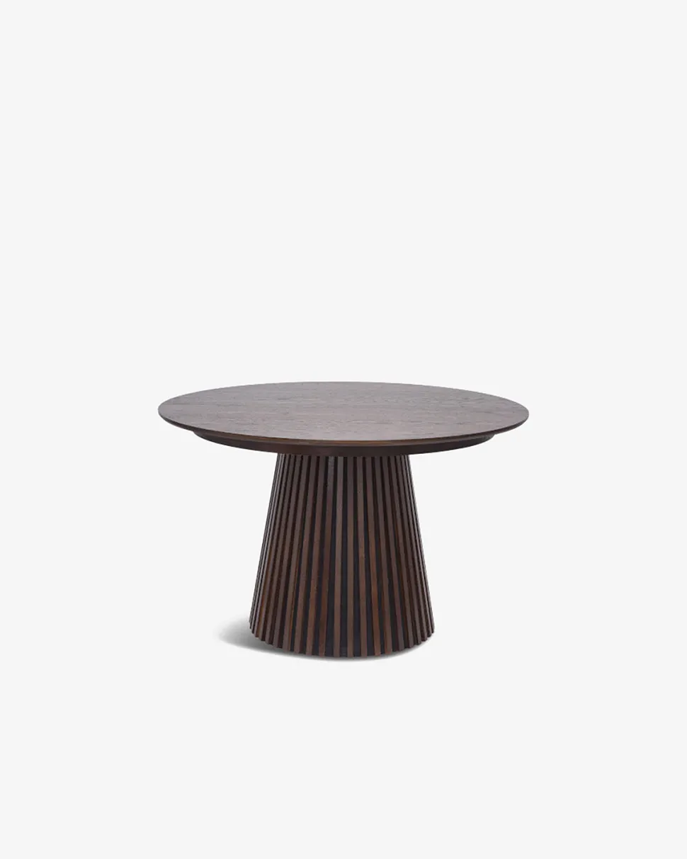 Stella spisebordet forener bløde former med smarte funktioner og et smukt, moderne udtryk. Bordet har en rund bordplade i smoked eg finer med en diameter på 120 cm – ideel til hyggelige måltider og samtaler i øjenhøjde.