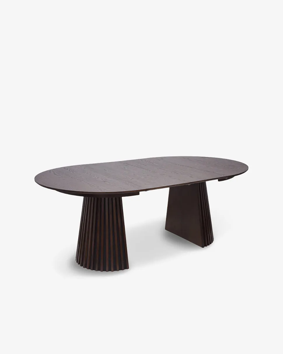 Bordet kan nemt udvides med de medfølgende tillægsplader, så det opnår en samlet længde på 200 cm. Perfekt, når der kommer gæster. Den centrale sokkel med lodrette lameller tilføjer både karakter og stabilitet og giver god benplads hele vejen rundt.