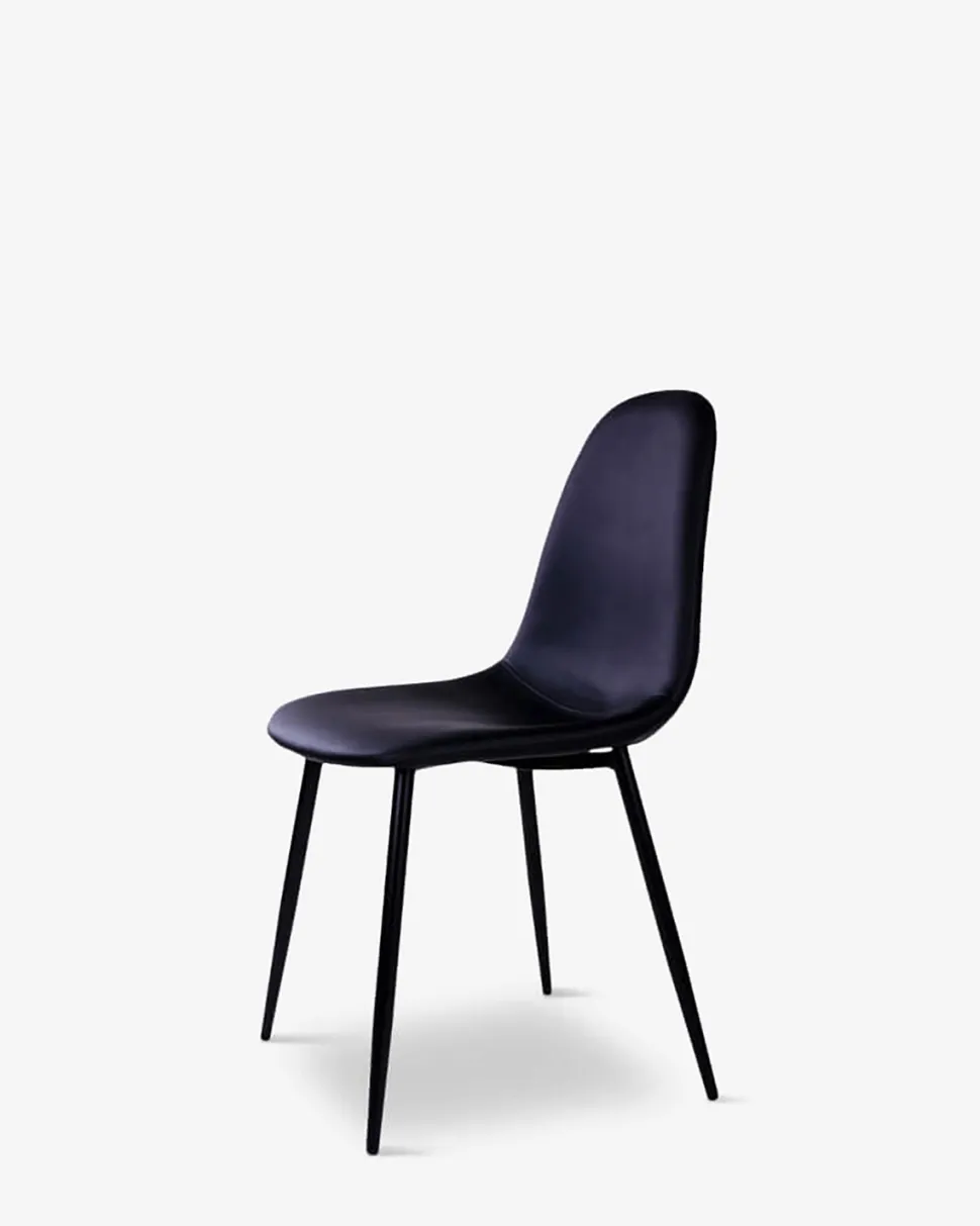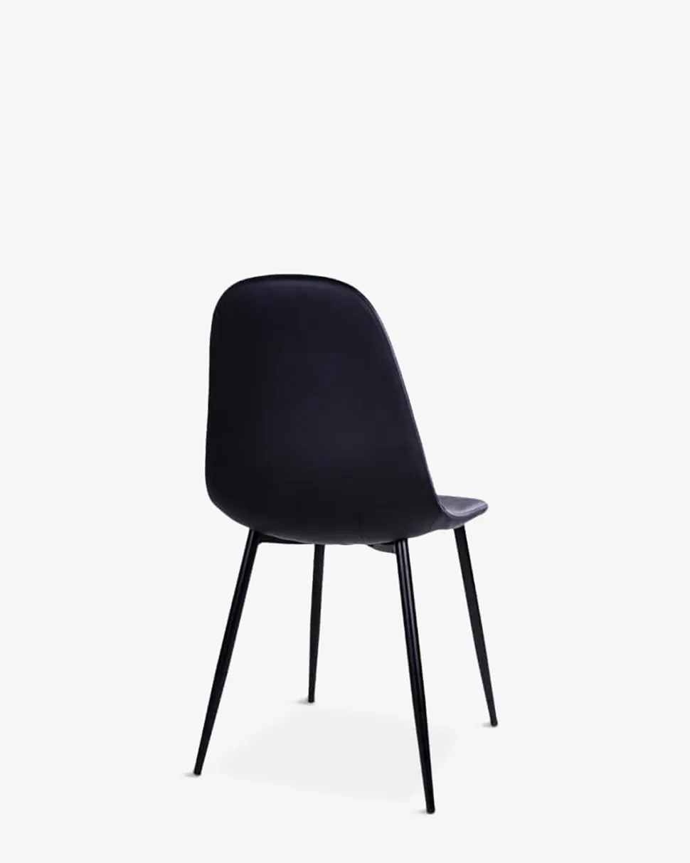 Flot og enkel spisebordsstol i nordisk design, monteret med sort tekstillæder og sort stel.