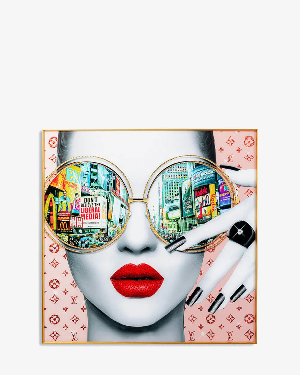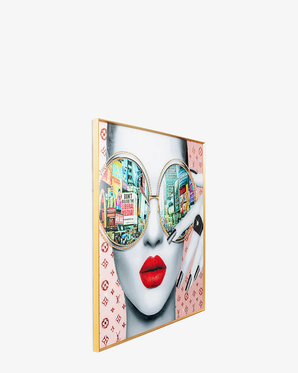 Det store Glasvægbillede kombinerer New York Citys ikoniske skyline med et stilfuldt portræt af en model for et unikt udtryk.