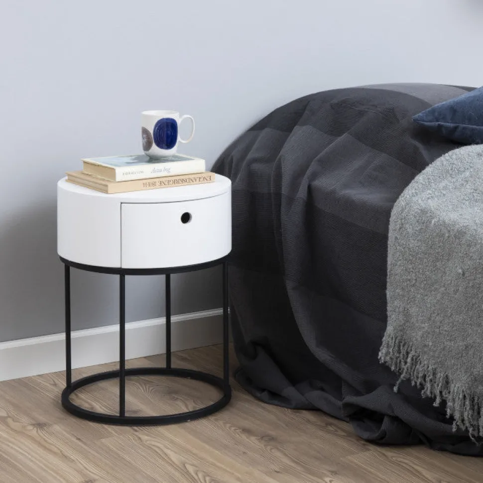 Stilrent, hvidt rundt sengebord med mat sort metalstel. Sengebordet har en charmerende skuffe til opbevaring.