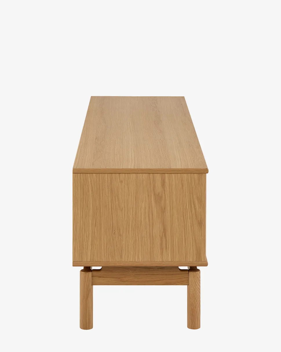 Opbygningen består af 2 låger på siderne med lukket opbevaring samt et åbent rum med hylde i midten – ideelt til elektronik, mediebokse eller dekoration. Det slanke design giver et luftigt udtryk under TV-området og passer godt ind i både minimalistiske og nordiske hjem.