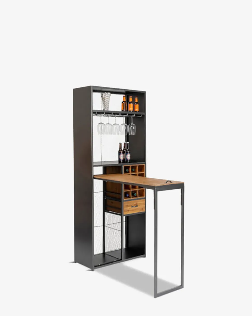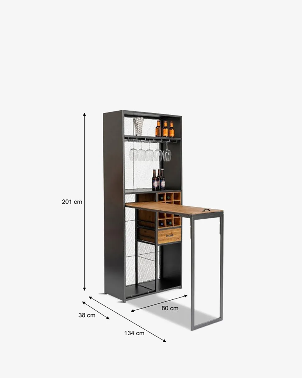 Vis din vinsamling frem på en dekorativ og anderledes måde i dette smarte barskab med rigtig god opbevaringsplads og med et praktisk bord der kan slås ud når baren er åben.