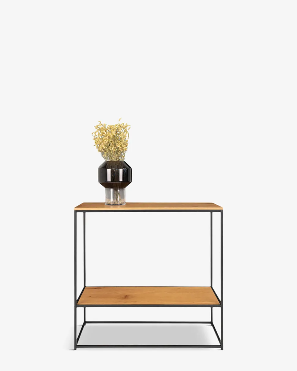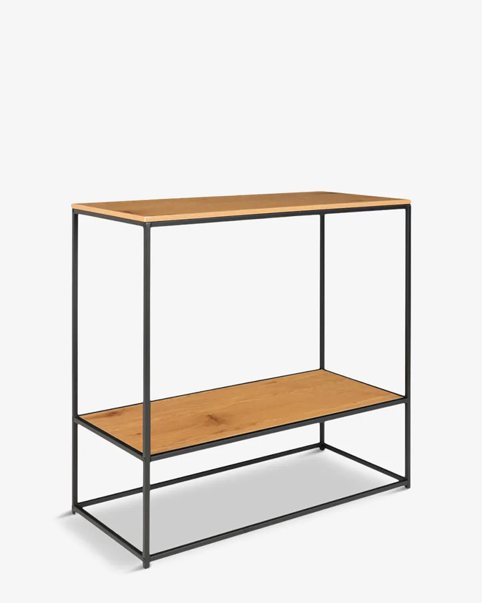 Vista konsolbord kombinerer det varme og naturlige udseende af eg melamin med et moderne, sort stel, hvilket skaber en smuk kontrast og tilføjer et stilfuldt touch til dit hjem.