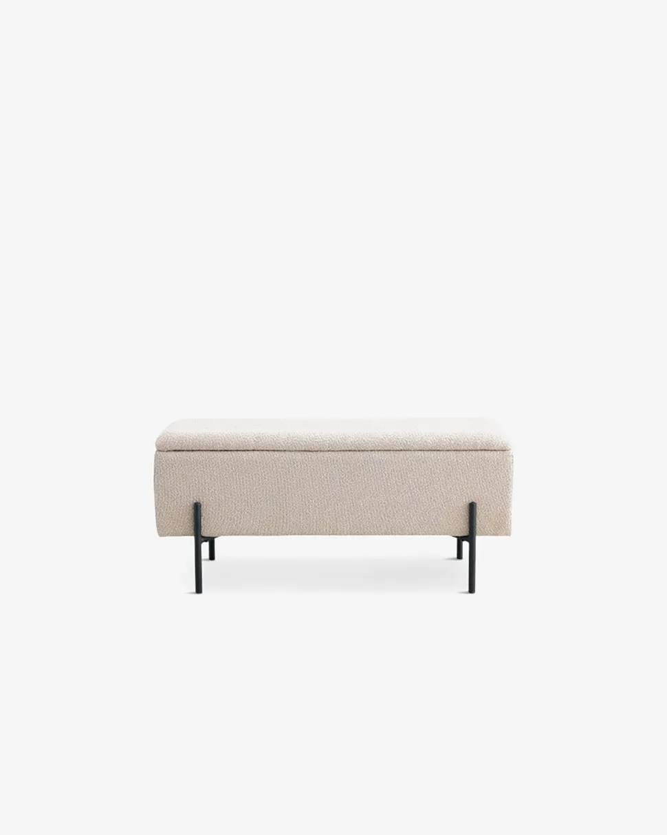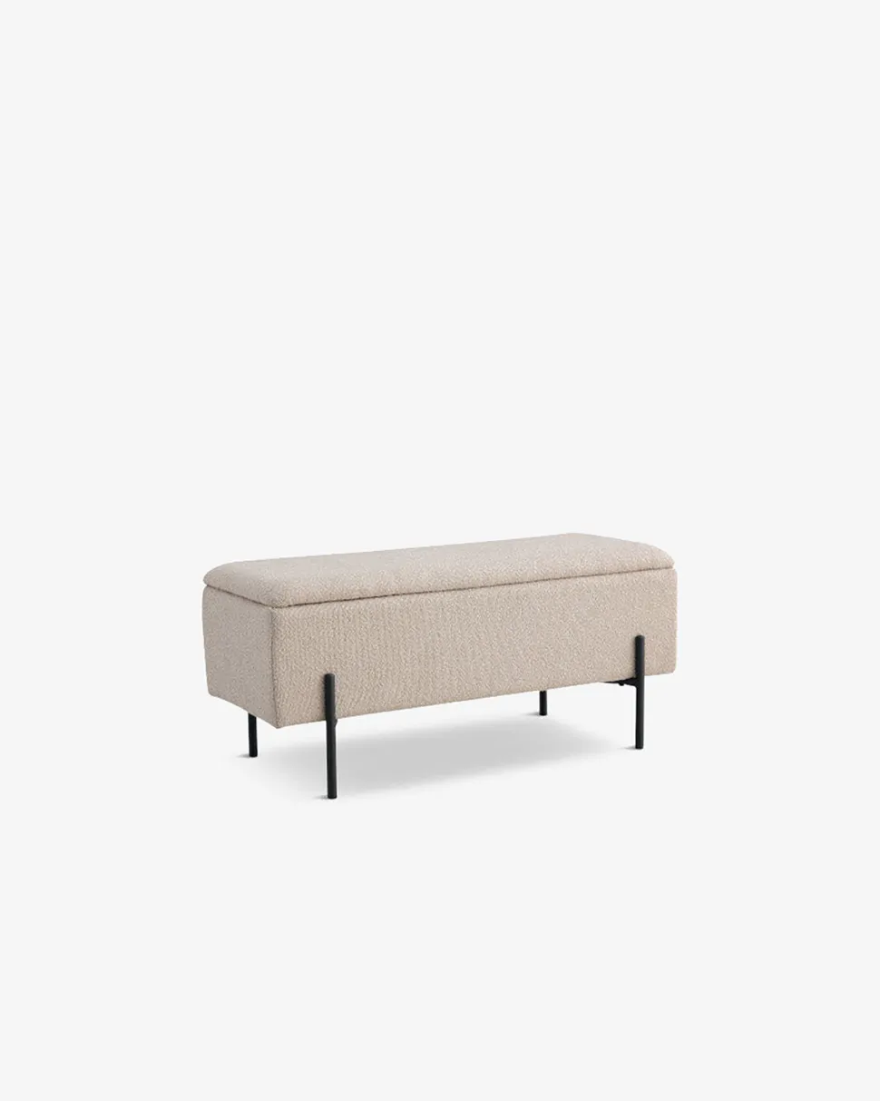 Her får du en elegant bænk i beige bouclé, der kan bruges både i stuen, entréen eller soveværelset som et stilfuldt møbel.
