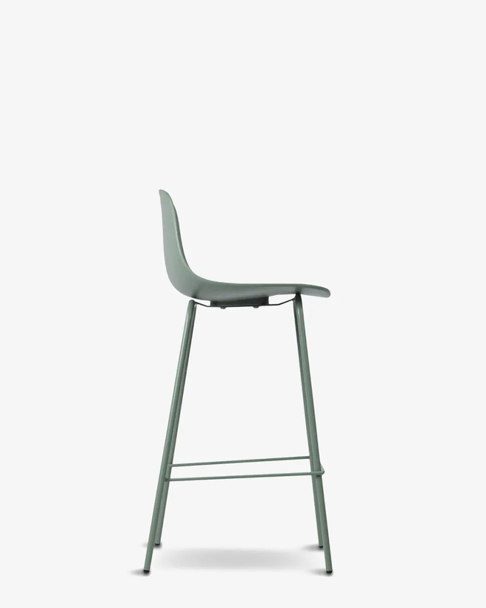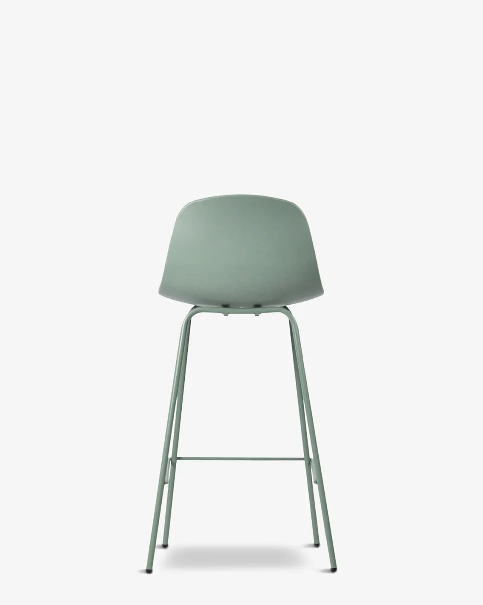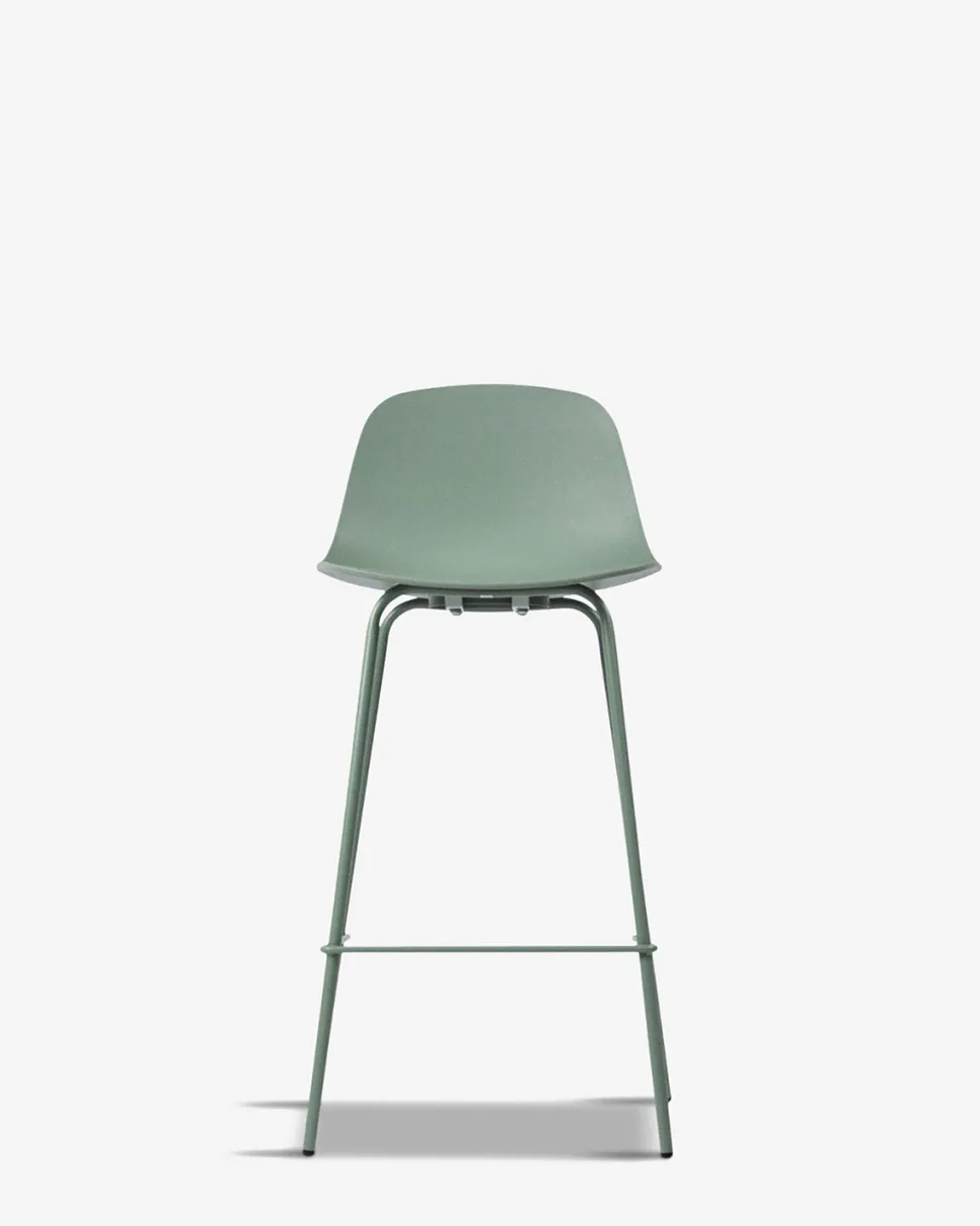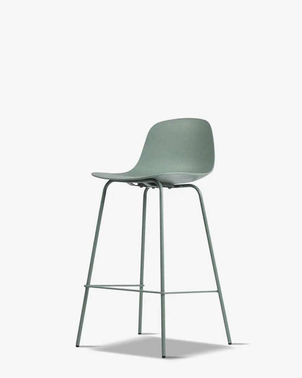 Whitby barstolen findes i 5 trendy farver, her vist i støvet grøn, med matchende metalben.