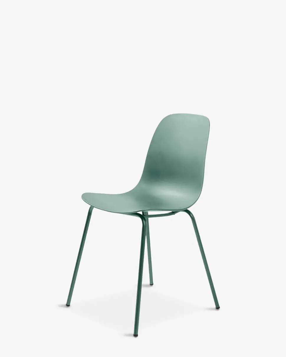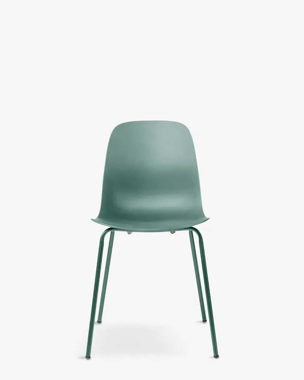 Whitby stolen fås i fem trendy farver, her vist i grøn, med matchende grønne metal ben.