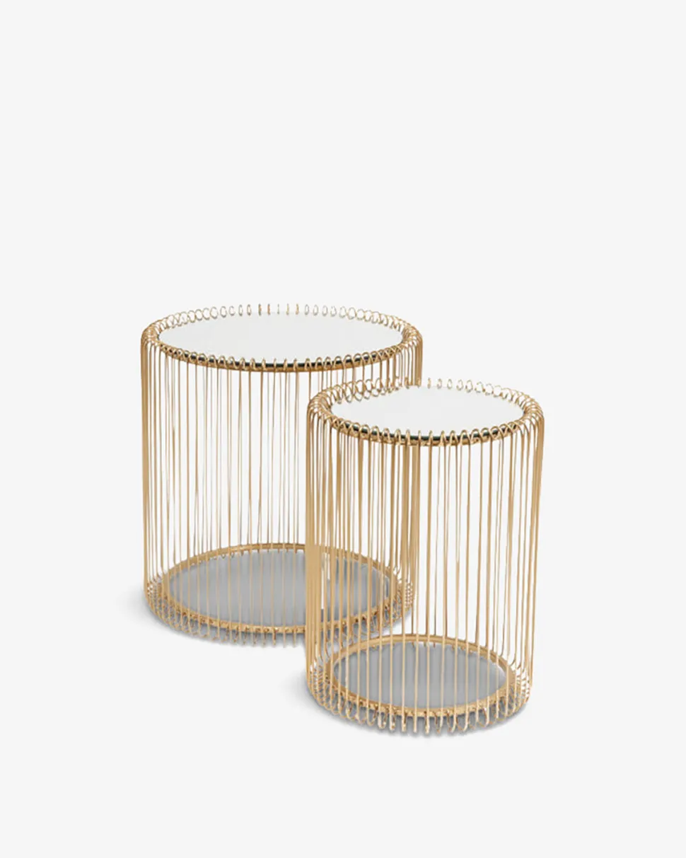 Hjørnebordssæt i messing med elegant spejlglasplade. Den lette stil gør dem ideelle som små sideborde.