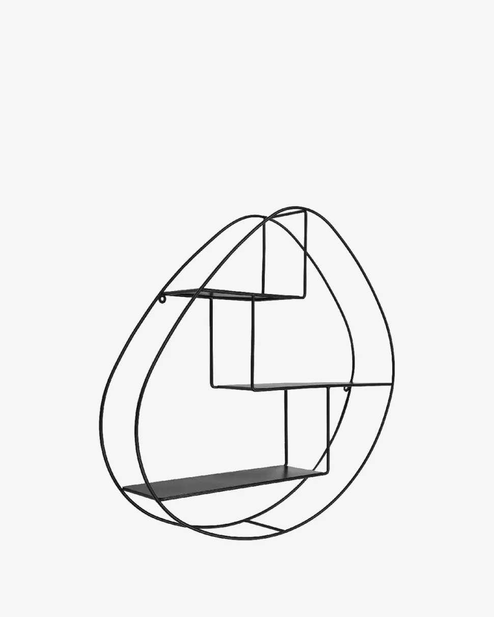 Denne væghylde kombinerer funktionalitet med et stilrent og kunstnerisk udtryk. Det asymmetriske, dråbeformede design giver et moderne og let udtryk, der passer perfekt ind i både minimalistiske og nordiske indretninger. De tre små hylder giver plads til dekorationer som planter, stearinlys, små figurer eller billeder.