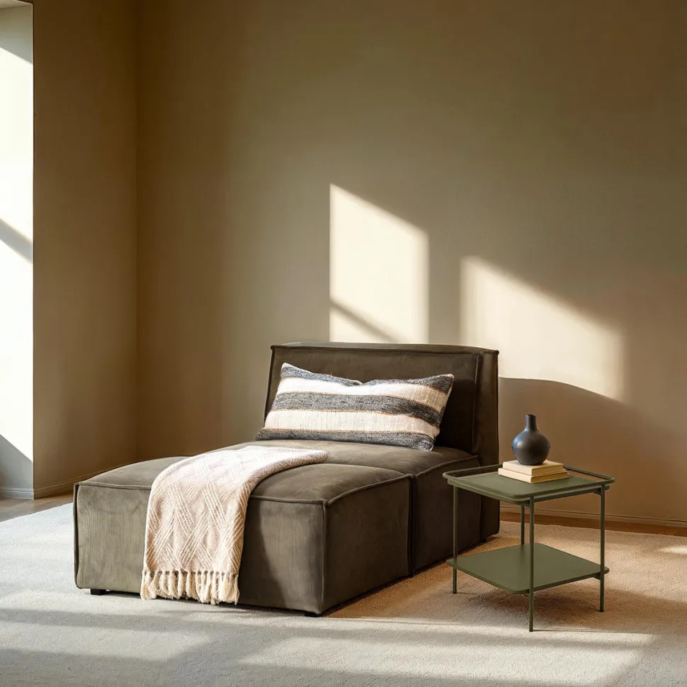 Sidebordets kompakte størrelse gør det perfekt ved sofaen, i læsehjørnet eller som natbord. Den olivengrønne farve tilfører et roligt og personligt udtryk, der skaber varme i indretningen.