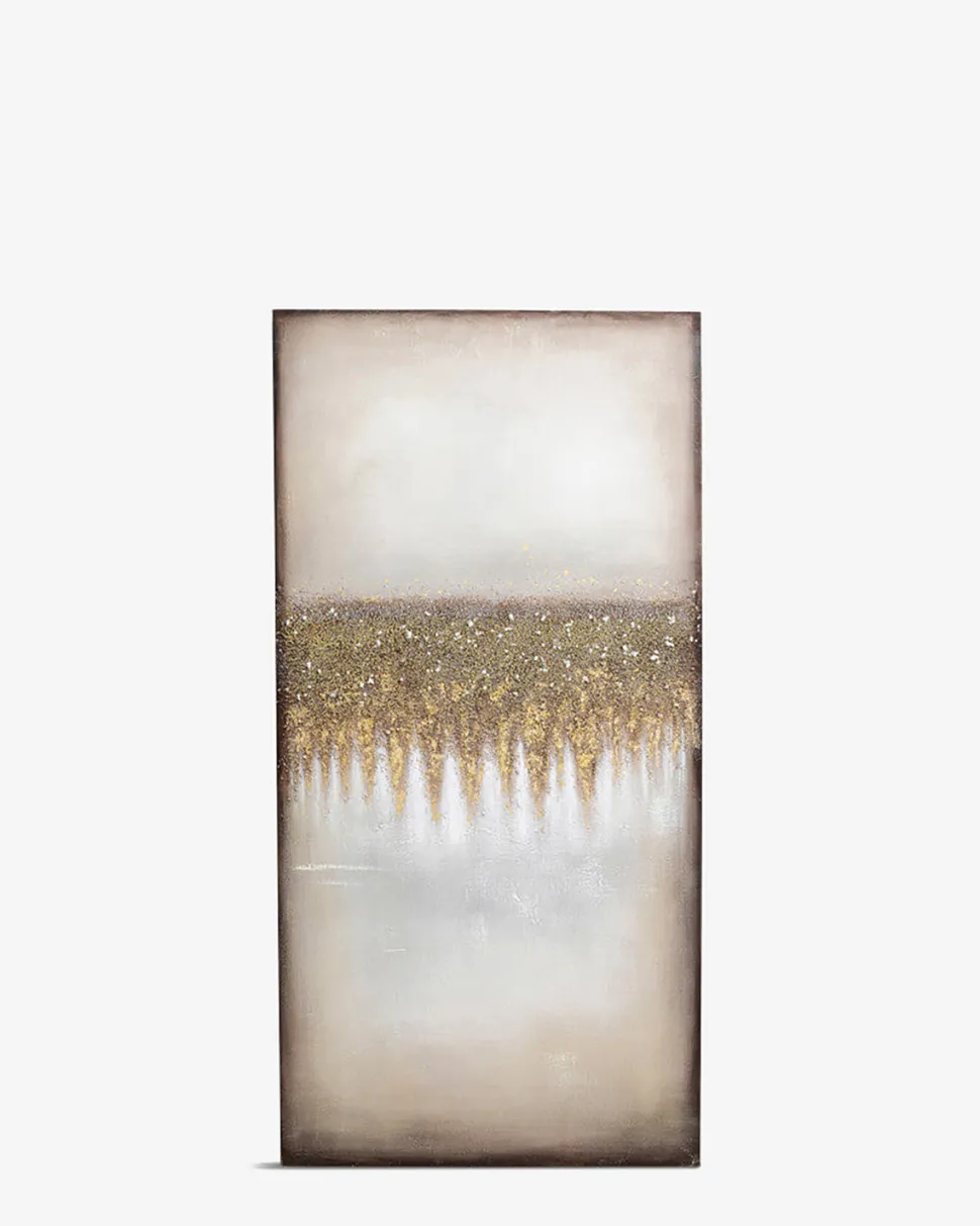 Imponerende vægmaleri i XL-format. Det er malet i hånden og dekoreret med et tredimensionelt bånd med små sten og guldprikker der strækker sig lige over maleriet som stjernestøv.