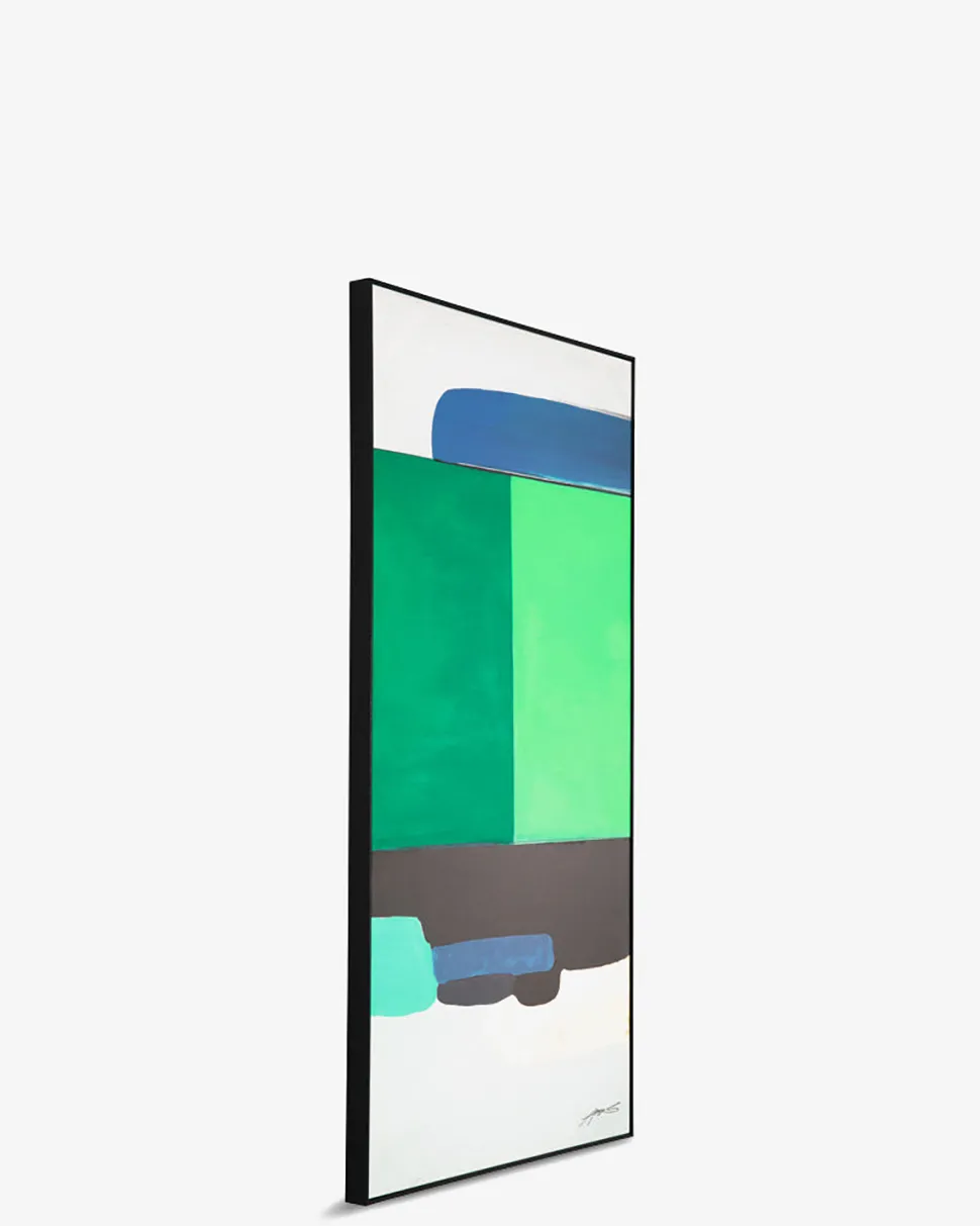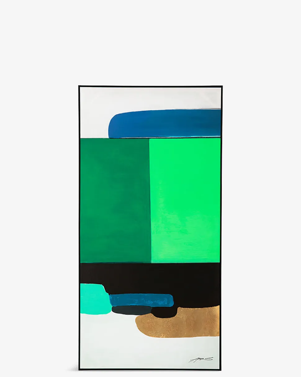 Det er malet i hånden og samspillet mellem de forskellige farver skaber et flot maleri, man ikke bliver træt af at kigge på.