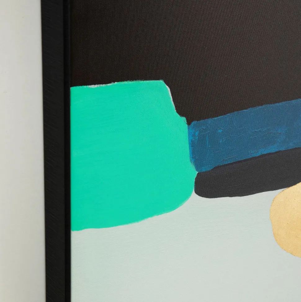 Dekorativt og farverigt vægmaleri med sort ramme.