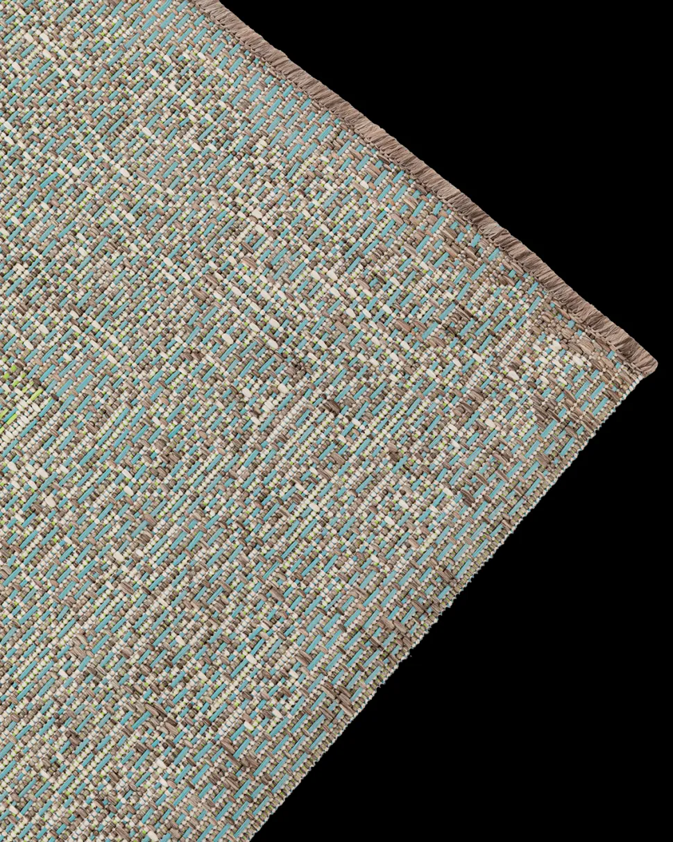 Tæppet er fremstillet i robust polypropylen, der tåler intensiv brug og er let at vedligeholde. Den skridsikre gummibagside sikrer stabil placering på både terrasse og gulv.