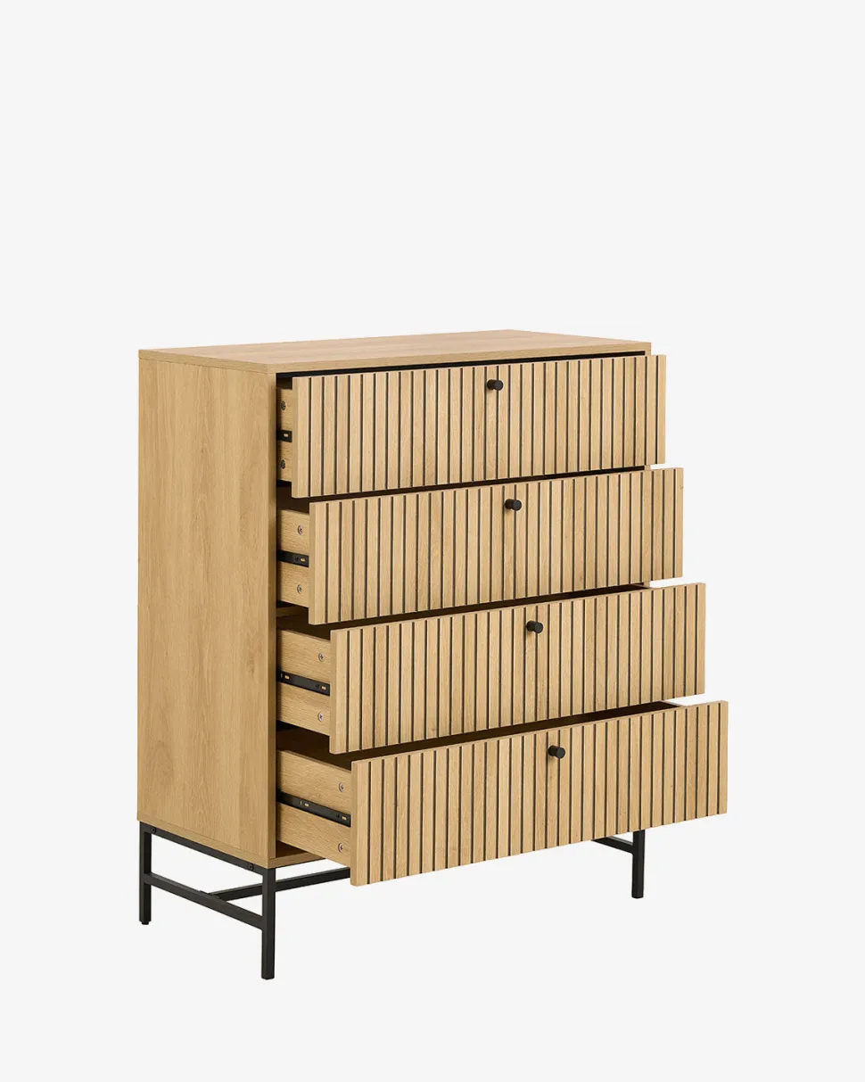 De fire rummelige skuffer giver god opbevaringsplads til tøj, tekstiler eller andre hverdagsting.
