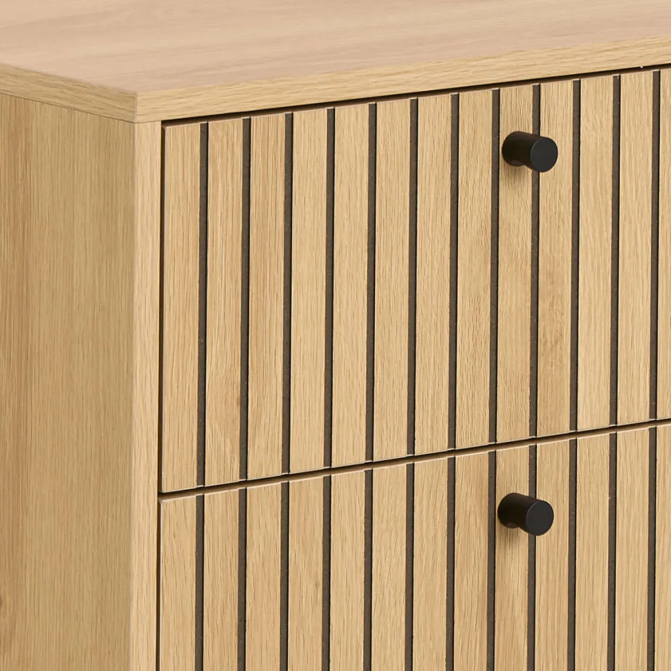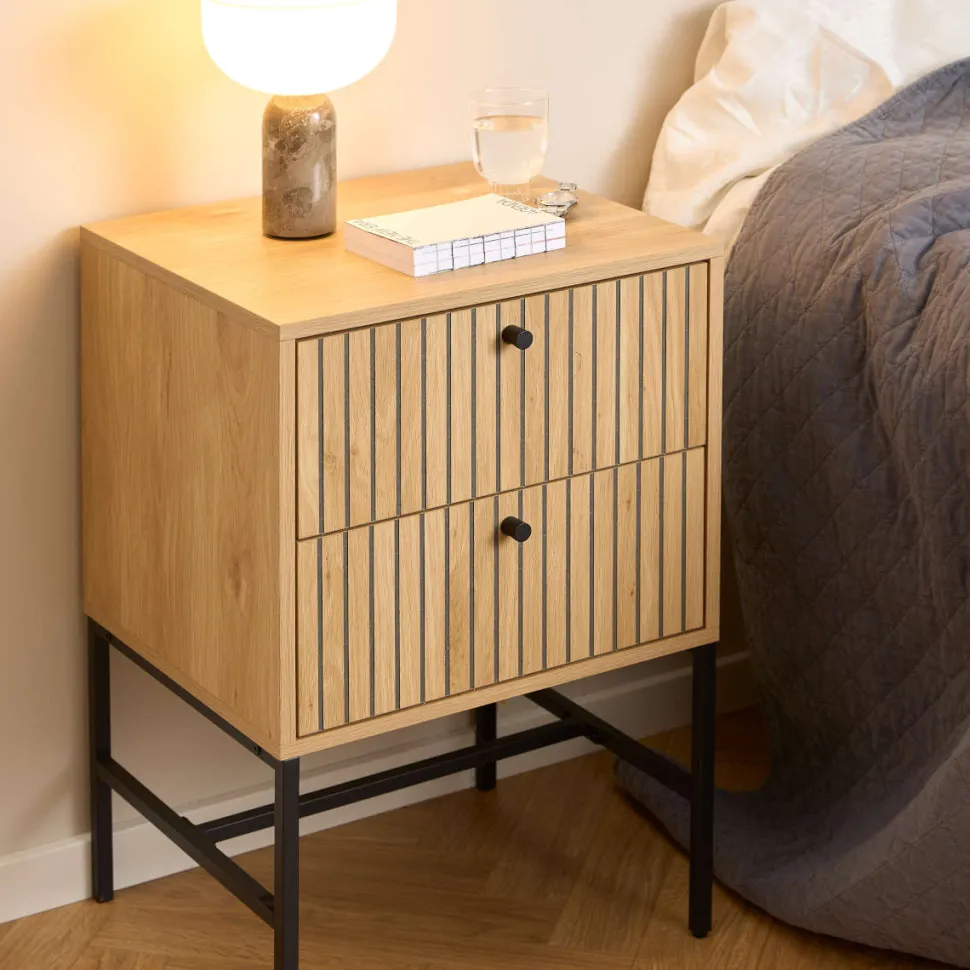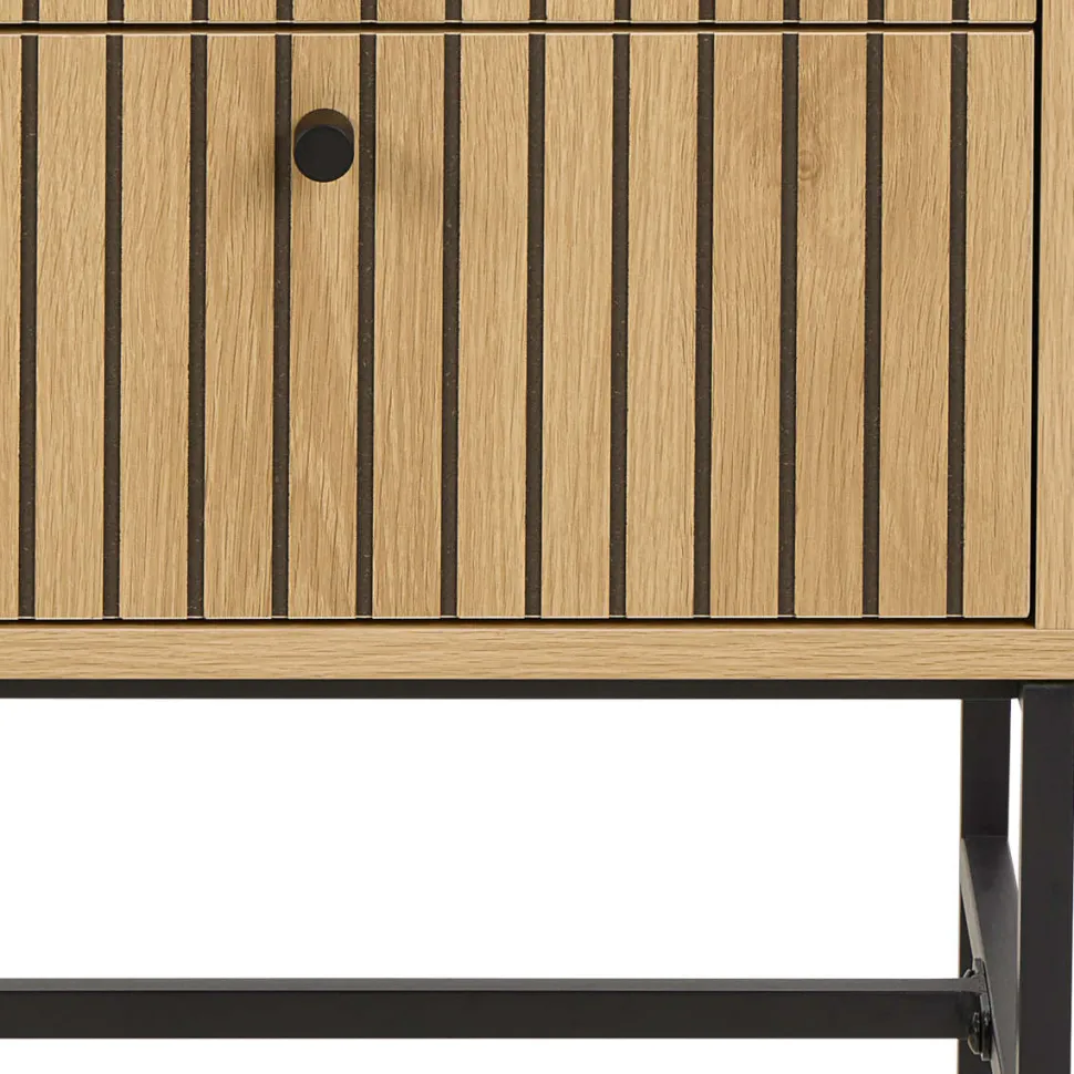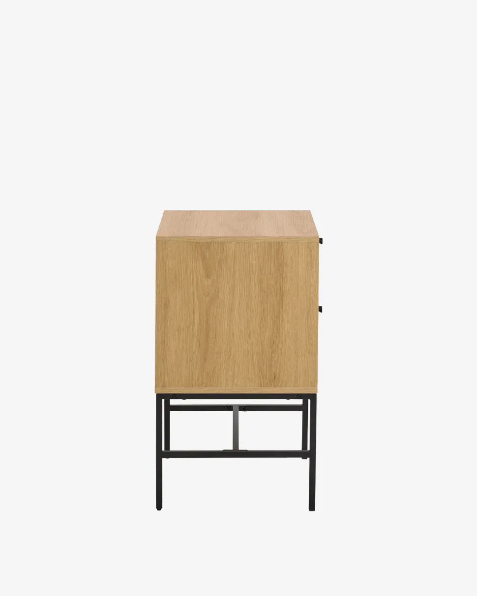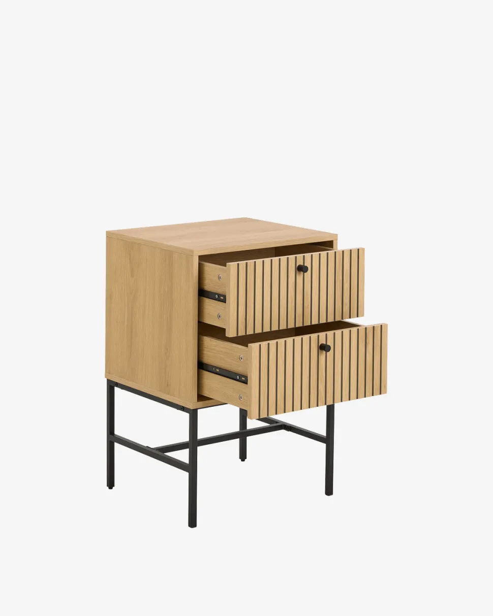 De to rummelige skuffer giver praktisk opbevaringsplads til hverdagens småting, mens den åbne konstruktion og kontrasten mellem trælook og metal giver et moderne twist.