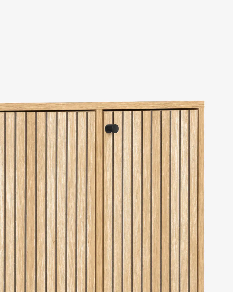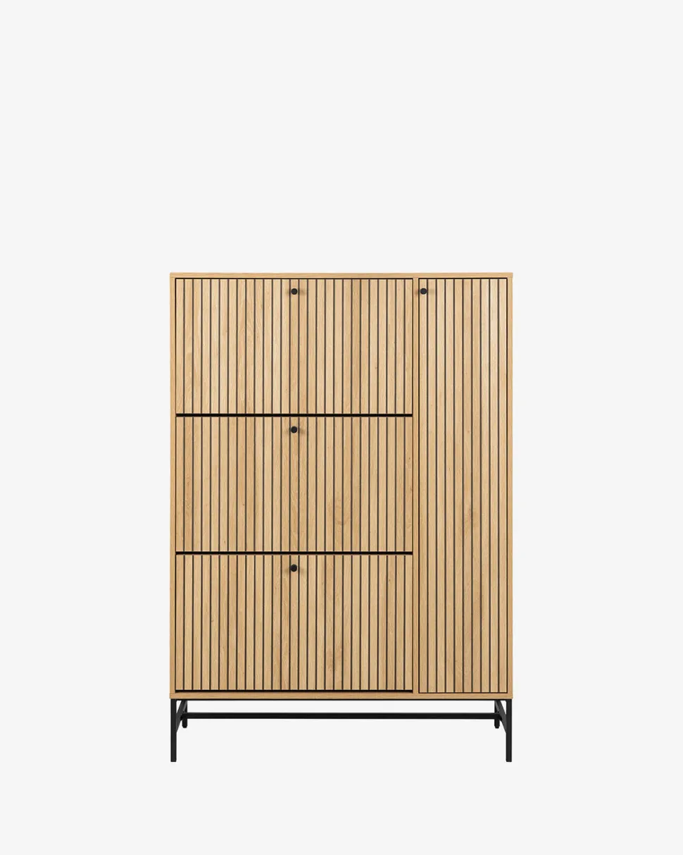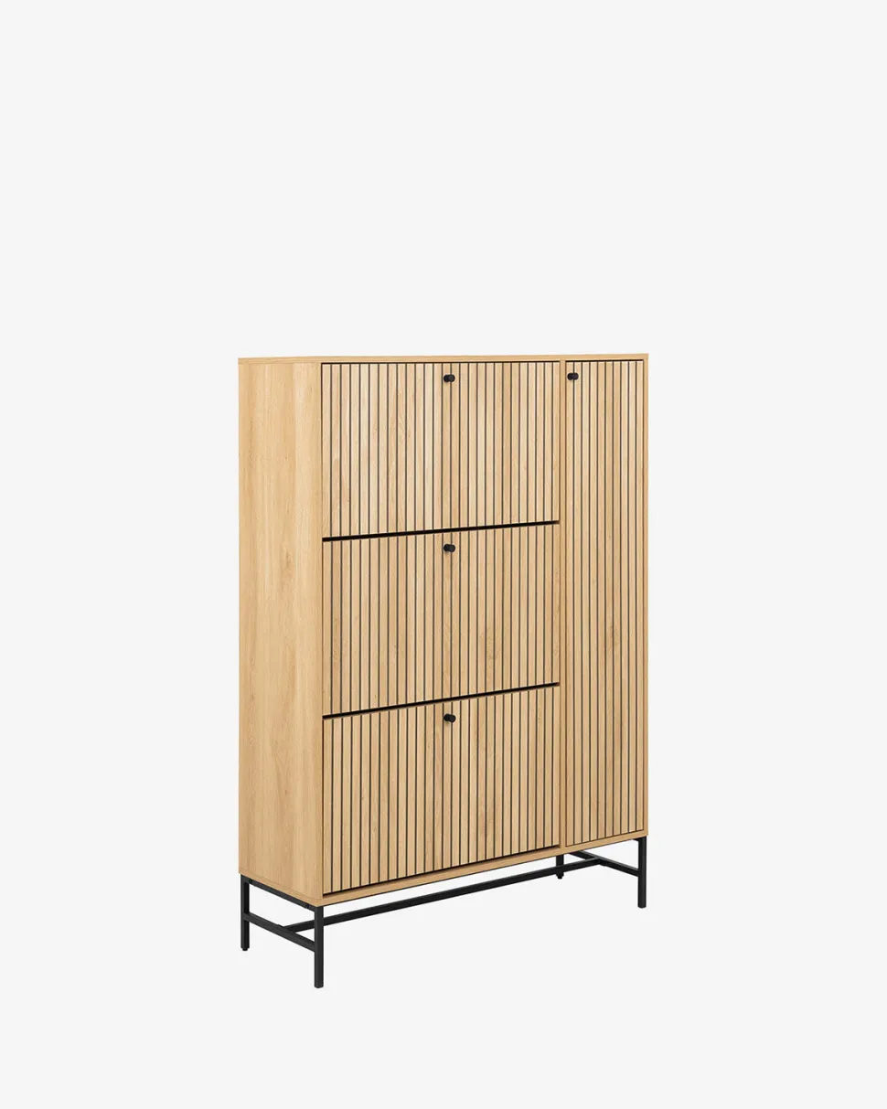 Albany skoskabet kombinerer praktisk opbevaring med et slankt og elegant nordisk design. Skabet er udført i eg melamin med lodrette lameller på fronten, som skaber et smukt og harmonisk udtryk, mens det passer naturligt ind i moderne indretninger.