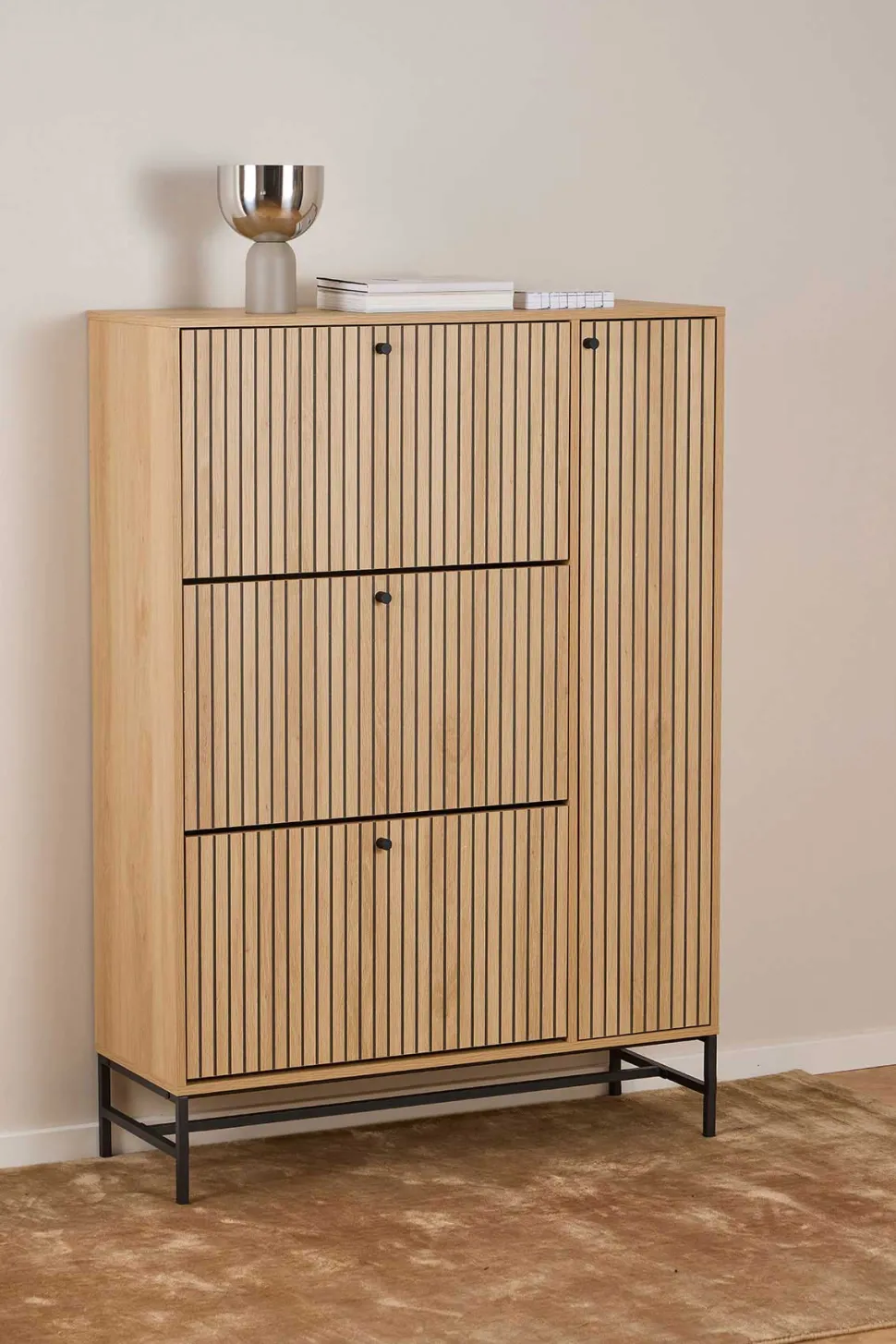 Albany skoskab – Albany skoskab – elegant og praktisk løsning til opbevaring af sko. Albany skoskabet er udført i eg melamin med slankt sort metalstel, som giver et let og stilrent look.