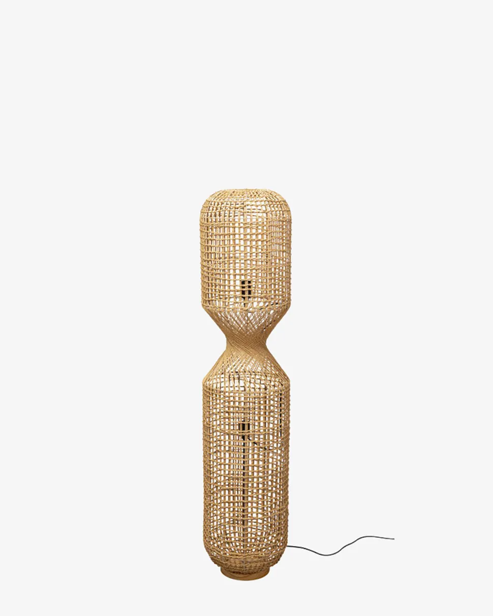Med sin kunstnerisk vævede lampeskærm i rattan bringer denne store Aloha gulvlampe i natur et naturligt og stilfuldt præg til dit hjem.