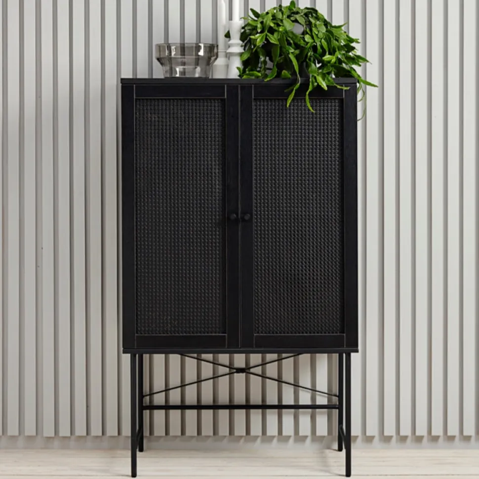 Skænken er udført i melamin og polyrattan, så den er nem at vedligeholde.