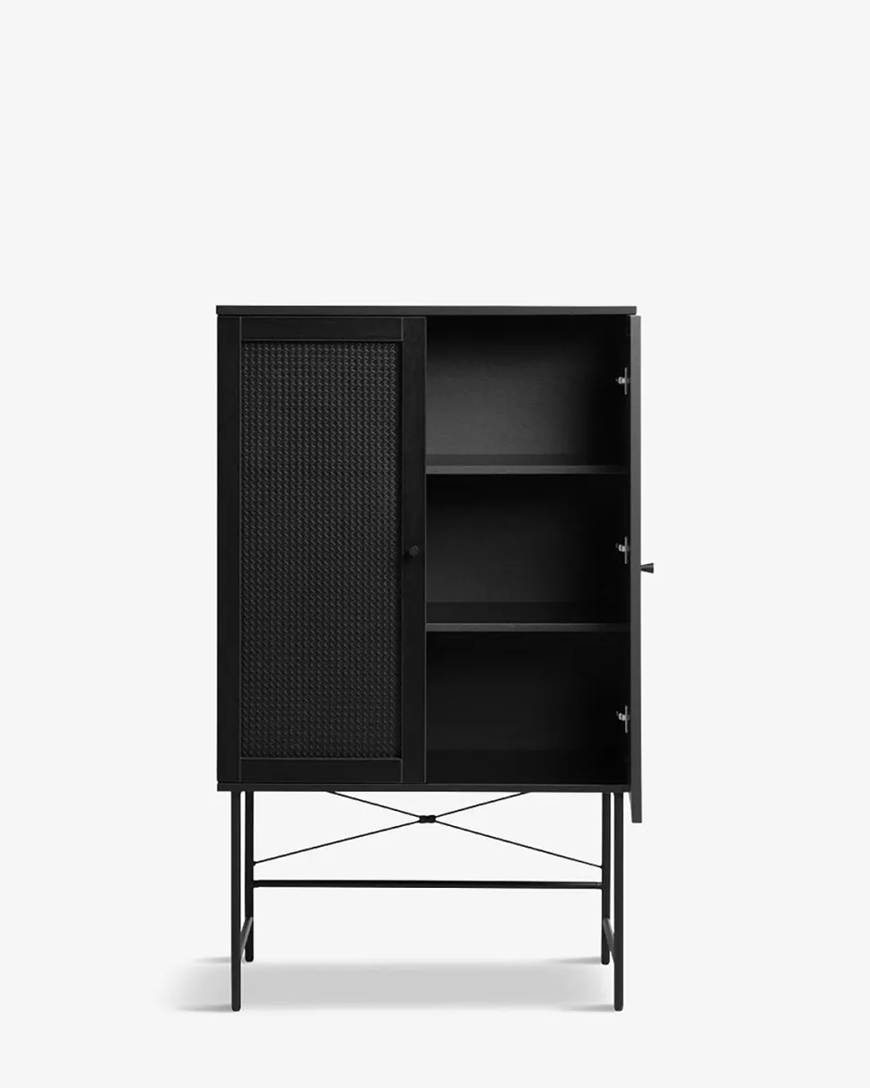 Skænken har to låger der er udformet med bøjet polyrattan der danner et smukt mønster på forsiden af begge låger. Bag lågerne er rummene inddelt med to hylder, så der er god opbevaringsplads. De høje slanke ben er med til at give skænken et let udtryk.
