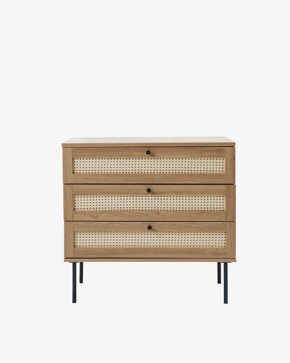 Kommoden er udstyret med tre skuffer, som giver praktisk opbevaringsplads til tøj, tekstiler eller andre hverdagsting. Den kompakte størrelse gør Alva kommoden velegnet til både soveværelse, entré eller stue, hvor der ønskes funktionel opbevaring uden at fylde for meget visuelt.