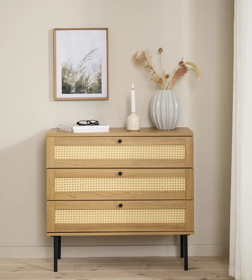 Alva kommode – nordisk design med fransk flet. Kommode med 3 skuffer og sort metalstel.