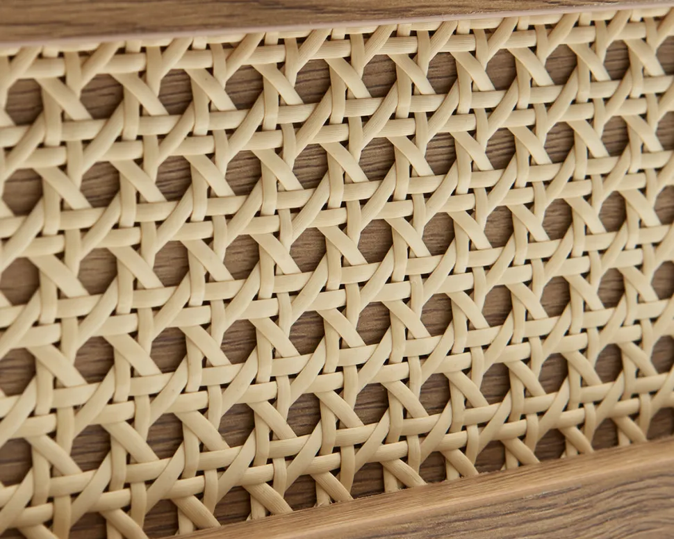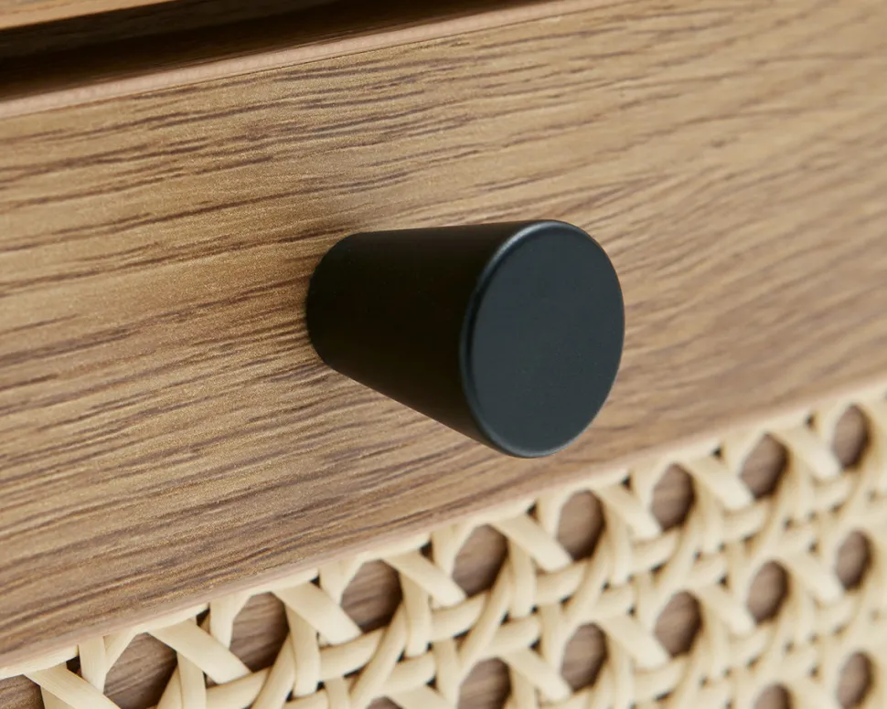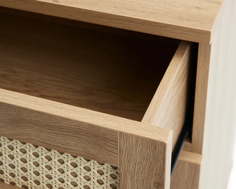 Alva kommoden er en del af Alva-serien og kombinerer et let, minimalistisk design med varme naturdetaljer. De franske fletfronter på skufferne giver kommoden et levende og indbydende udtryk, mens de sorte metalben tilfører et moderne og let løft.