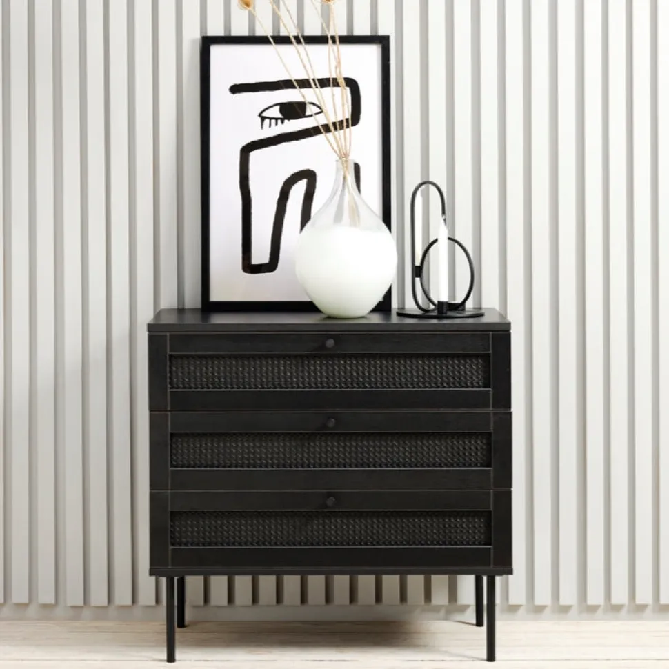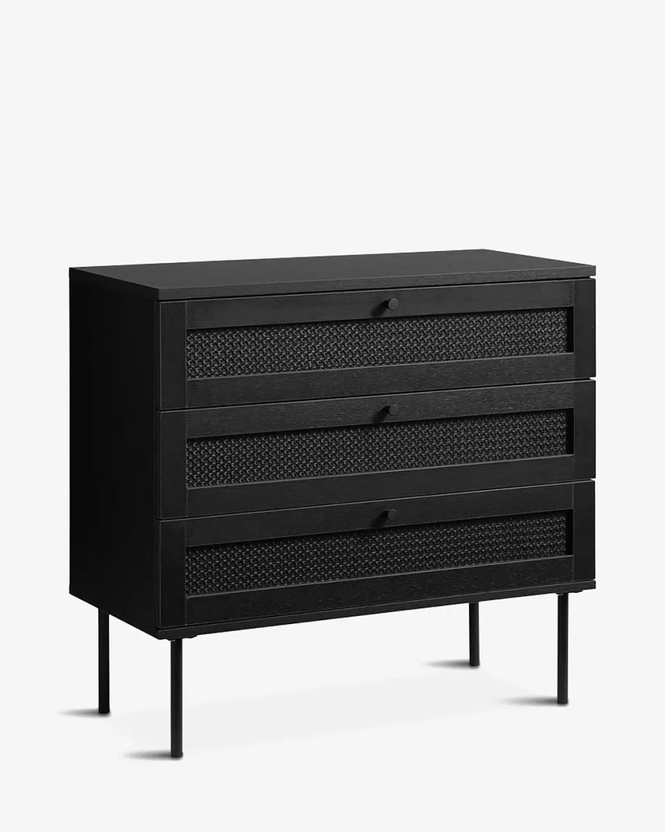 Alva kommoden er rigtig flot og moderne i sit look. Den har tre store skuffer, og fronten på skufferne er beklædt med polyrattan i et flot mønster der gør kommoden meget dekorativ.