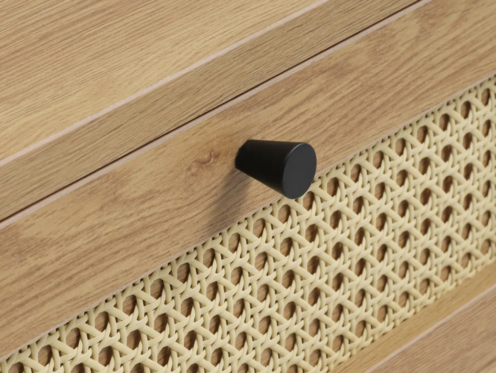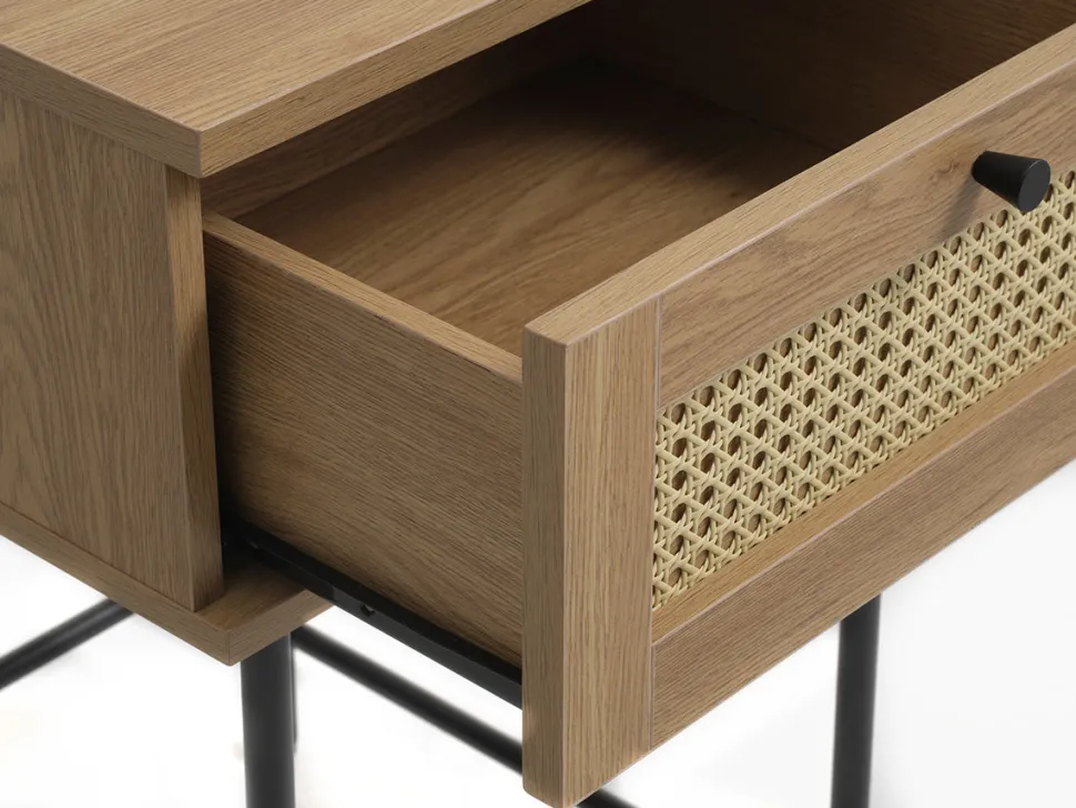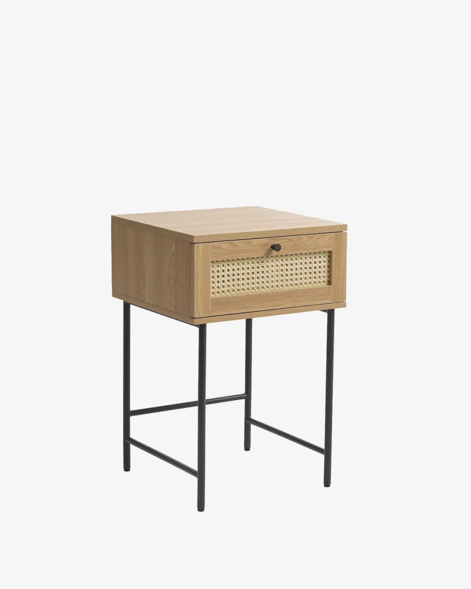 Alva sengebordet er en del af Alva-serien og forener et let, nordisk udtryk med dekorative naturdetaljer. Den franske fletfront på skuffen tilfører varme og karakter, mens det sorte metalstel giver møblet et moderne og luftigt look.