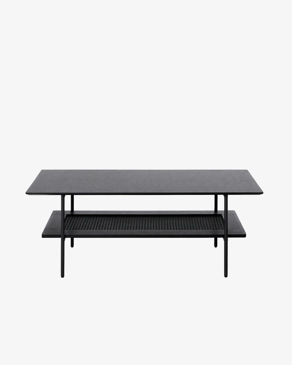 Alva sofabordet i sort er en del af Alva-serien og kombinerer et stilrent, moderne udtryk med varme detaljer. Den sorte overflade giver bordet et mere markant look, mens den flettede hylde under bordpladen tilfører struktur og karakter.