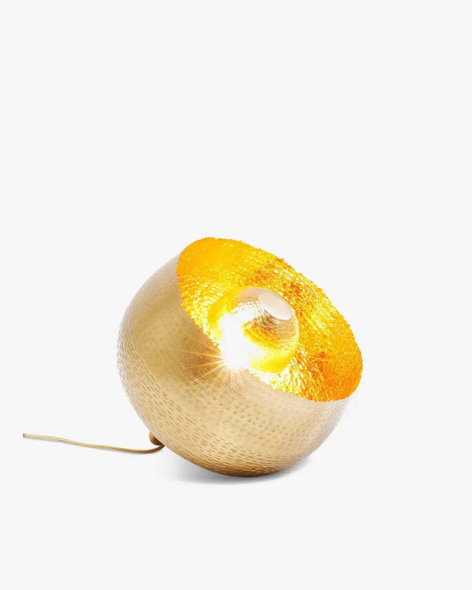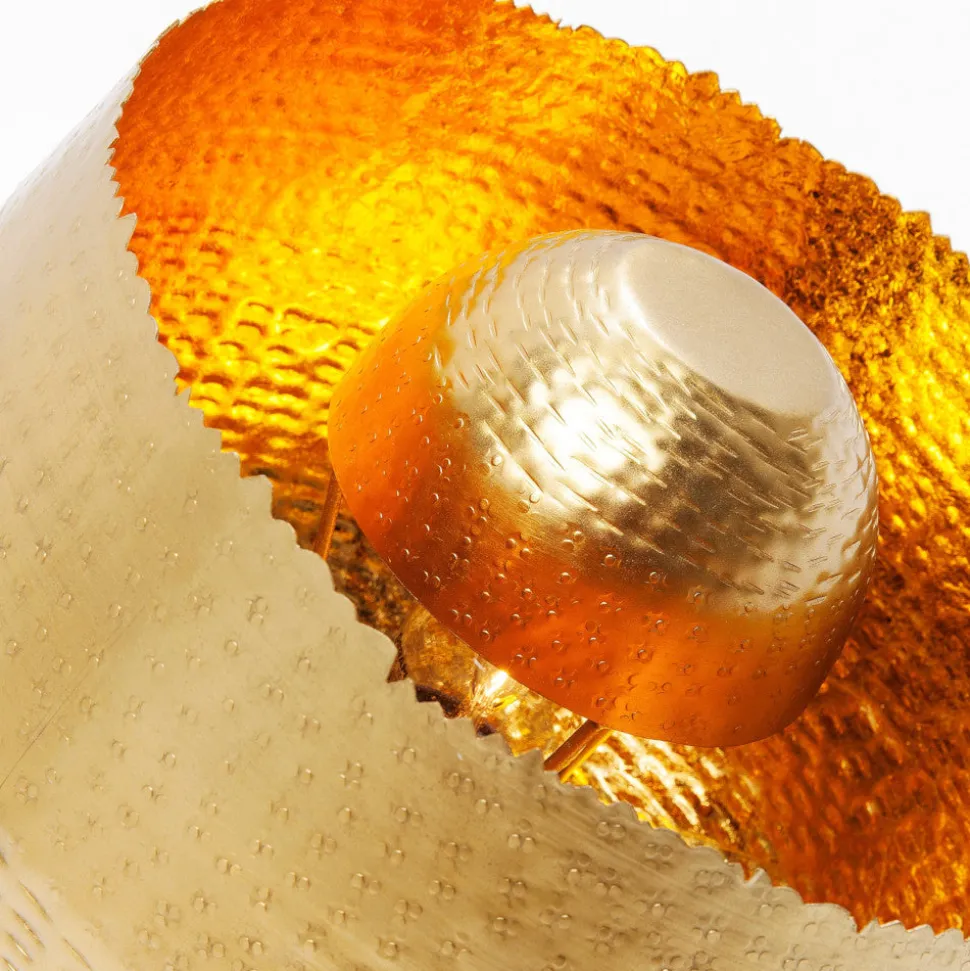 Gulvlampen er udført i messingbelagt stål, der giver et meget blødt og hyggeligt lys, og med sin hamrede overflade ser lampen ud som om den er hjemmelavet.