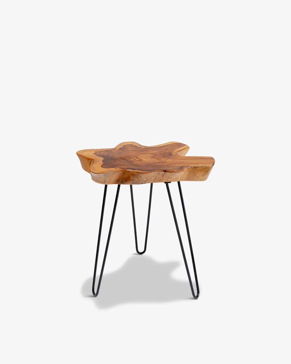Aspen sidebord er et smukt og unikt sidebord i teaktræ med en massiv træbordplade og sort metalstel.