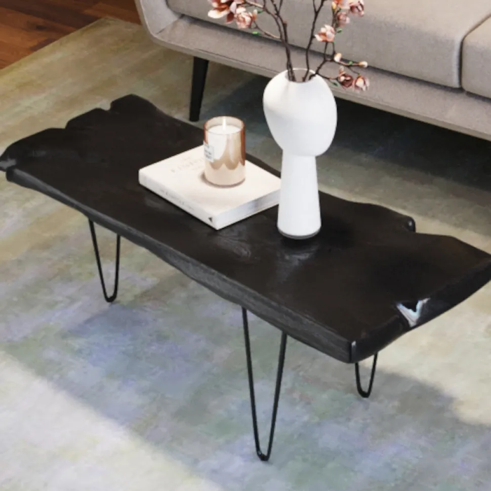 Aspen sofabord er et smukt og unikt sofabord i teak træ med massiv træbordplade og med sort metalstel.