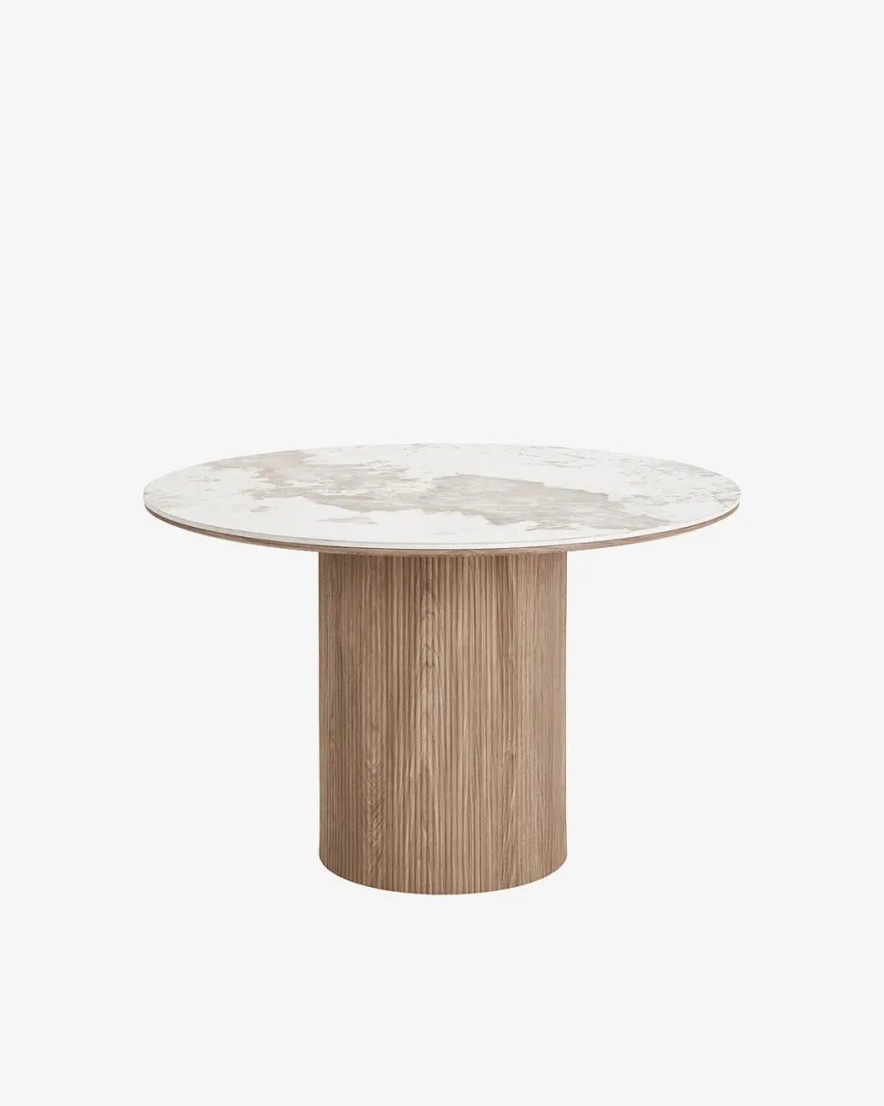 Den runde form skaber en social og indbydende stemning omkring bordet, hvor alle nemt kan samles. Bordet står på en rund sokkel med lamelriller i lys valnød farve, som tilfører varme og karakter. Stellet er udført i decopapir med en meget naturtro overflade og farve, der giver fornemmelsen af ægte træ kombineret med minimal vedligeholdelse.