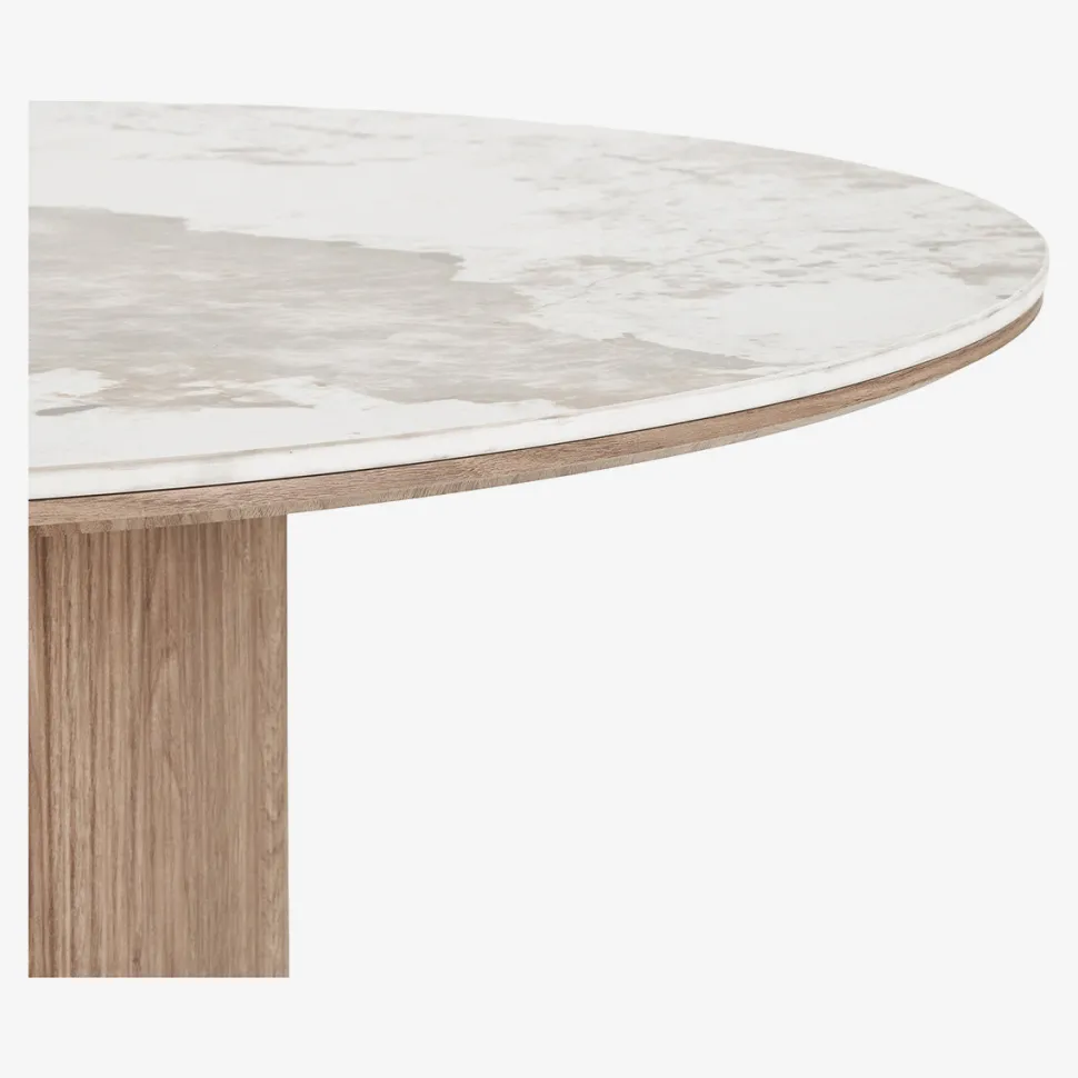 Athens spisebordet i rund udgave kombinerer et stilrent, moderne udtryk med praktisk funktionalitet i hverdagen. Bordpladen er udført i hvid keramik med brun marmorlook, som giver et eksklusivt og levende udtryk – helt uden behov for vedligeholdelse. Den keramiske overflade er både varmebestandig og pletafvisende, hvilket gør bordet ideelt til daglig brug.