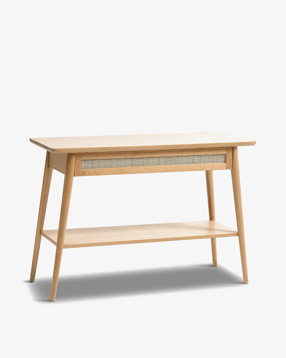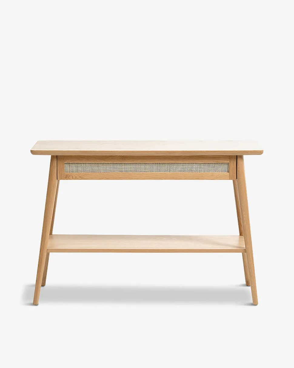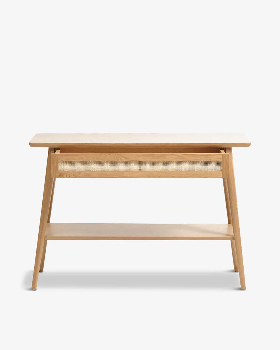 Konsolbordet har en bred skuffe, med front i lys flet, perfekt til nøgler og andet hvis bordet bruges i entréen.