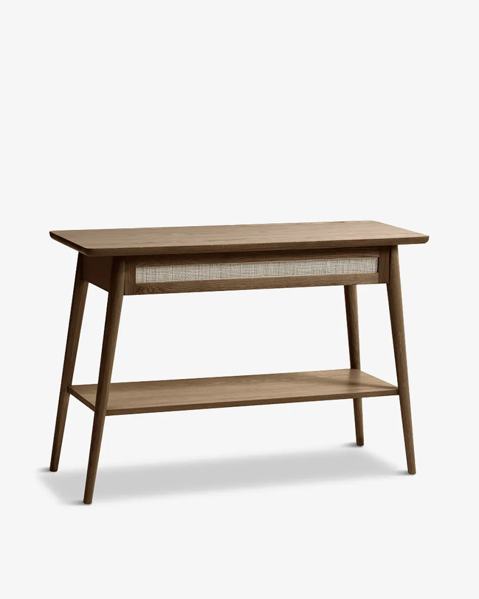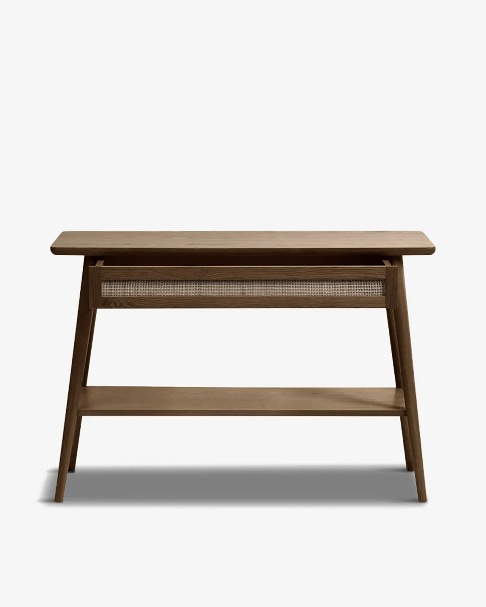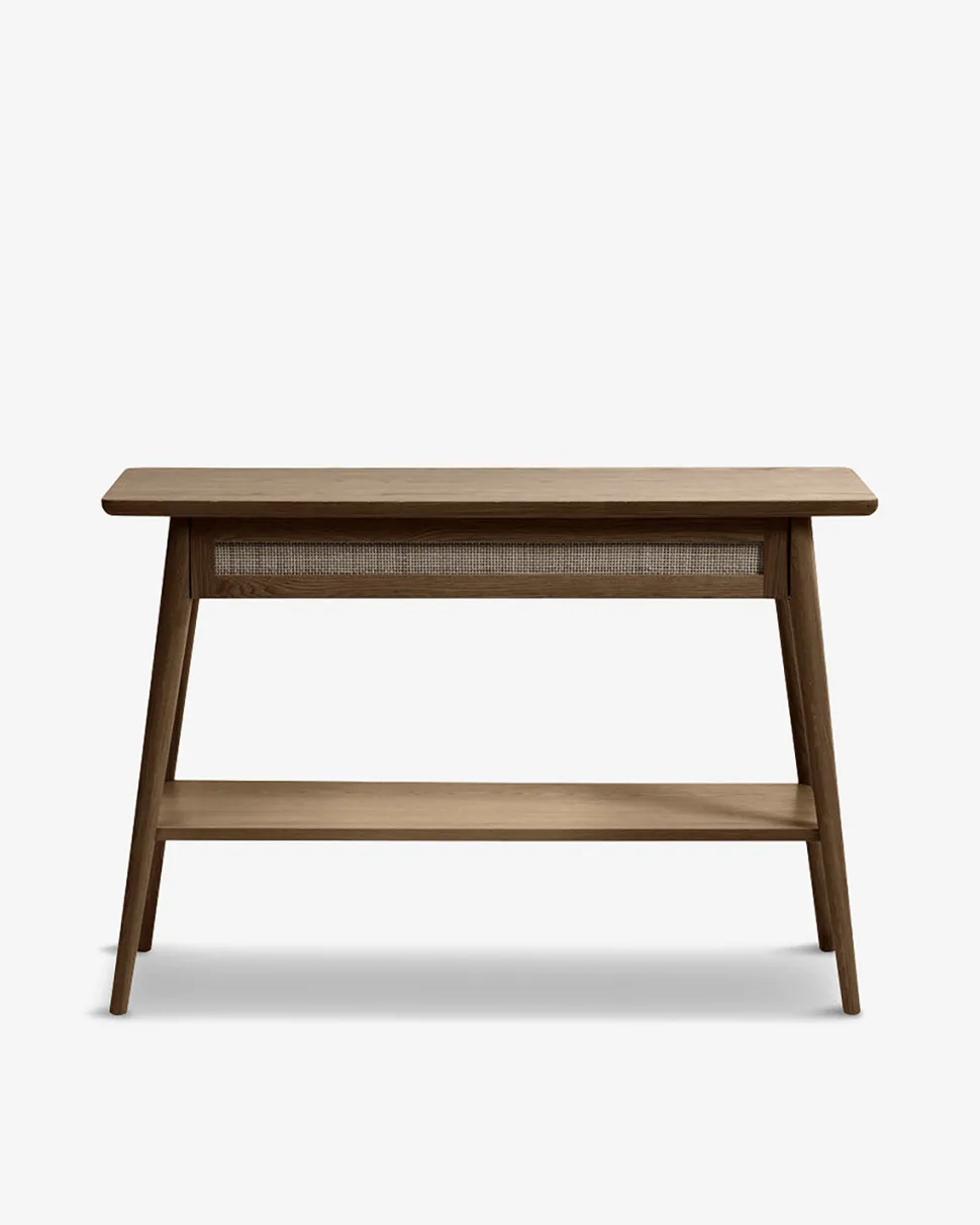Konsolbordet har en bred skuffe, med front i lys flet, perfekt til nøgler og andet hvis bordet bruges i entréen.