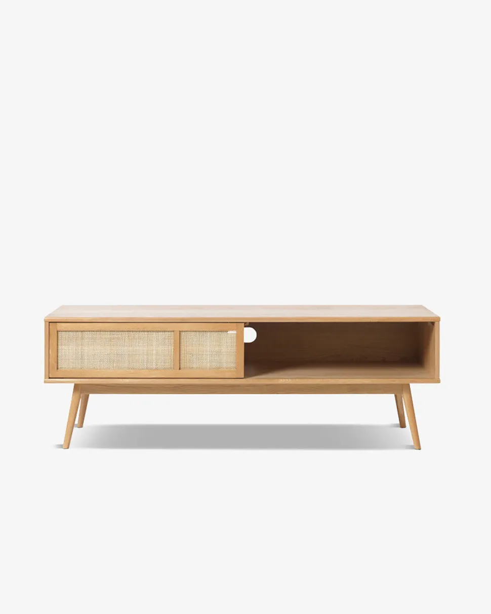 TV-bord udført i fineret eg med den naturlige glød og struktur. Perfekt som et stilfuldt samlingspunkt i stuen.
